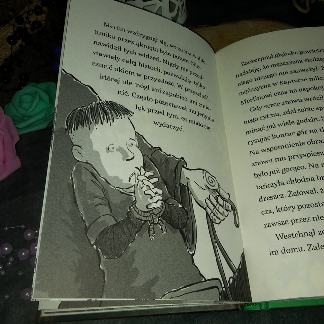 Byłam ciekawa, jak na zaledwie 96 stronach Tracey Mayhew przedstawi historie Merlina, ale muszę przyznać, że jestem pełna podziwu. Treść została uproszczona, tak, by młody czytelnik bez problemu się w niej odnalazł. Plusem jest to, że pomimo ugładzonej formy i bez zbędnej przemocy został zachowany klimat powieści. Nadal czuć niepewność, strach i tajemnicę. Co lepsze, nie odczuwa tego, tylko dziecko, ale i dorosły. Może nie tak mocno, jak w oryginalnej wersji, ale i tak uważam to za ogromny plus. Dużym atutem są tutaj również wydarzenia, niedokończone zdania dające do myślenia i akcja, która nie zwalnia nawet na chwilę.