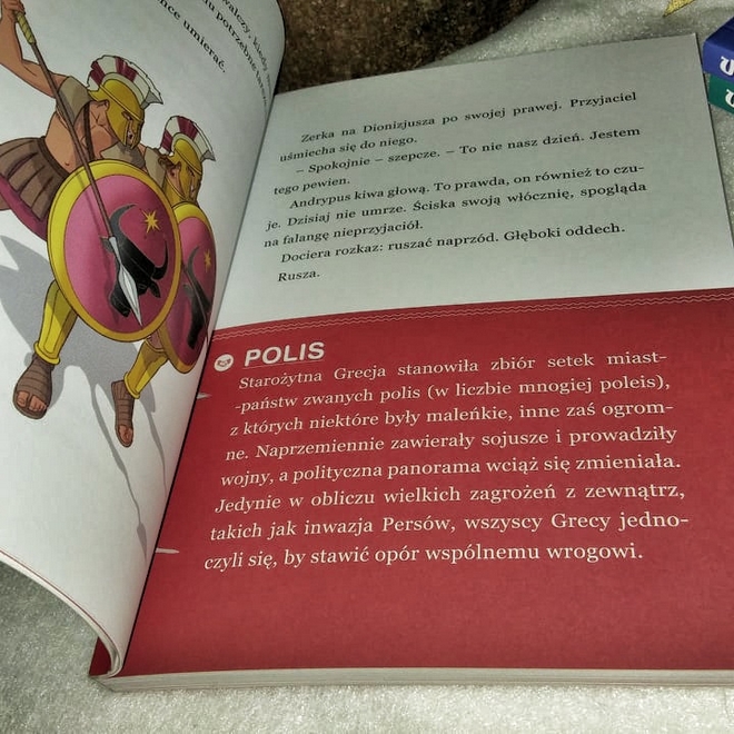 Podoba mi się zamysł całej serii. Grecy utwierdzają mnie tylko w przekonaniu, że to był strzał w dziesiątkę. Dzięki temu młody czytelnik poznaje nie tylko ciekawą opowieść pełna przygód, ale również się uczy. W każdej z książek w treści znajdują się podkreślone słowa, a na końcu rozdziału znajduje się ich definicja. Jak na początek poszerzania wiedzy jest naprawdę szczegółowa. Dla ułatwienia została zrobiona również metryczka mówiąca o podziale zagadnień na sztukę, gospodarstwo, wojsko, kulturę, a także społeczeństwo. Tym razem dowiemy się, jak ważna dla Greków była muzyka, że to w starożytnej Grecji powstały podstawy współczesnej matematyki czy też o tym, jakimi żeglarzami byli.