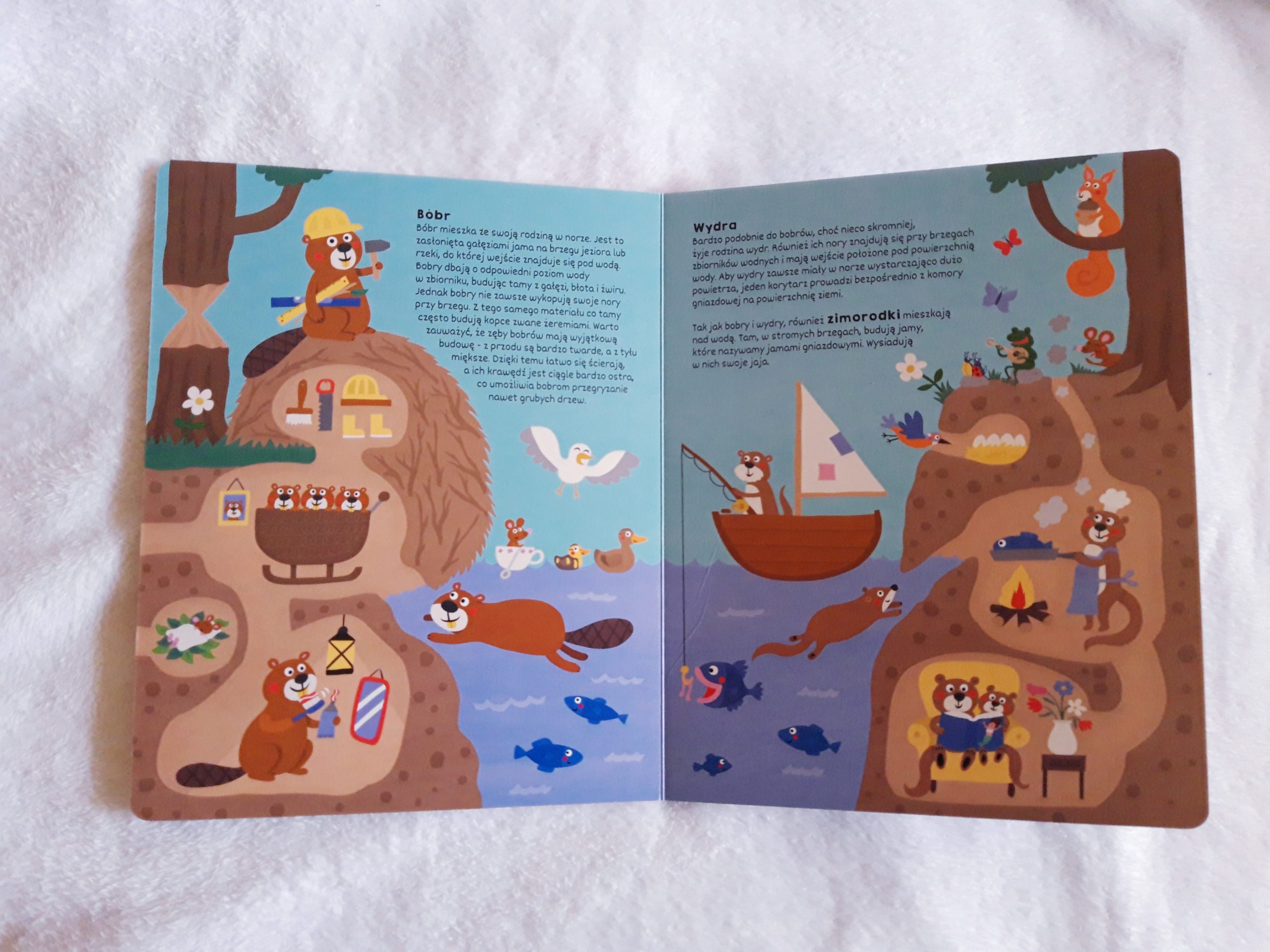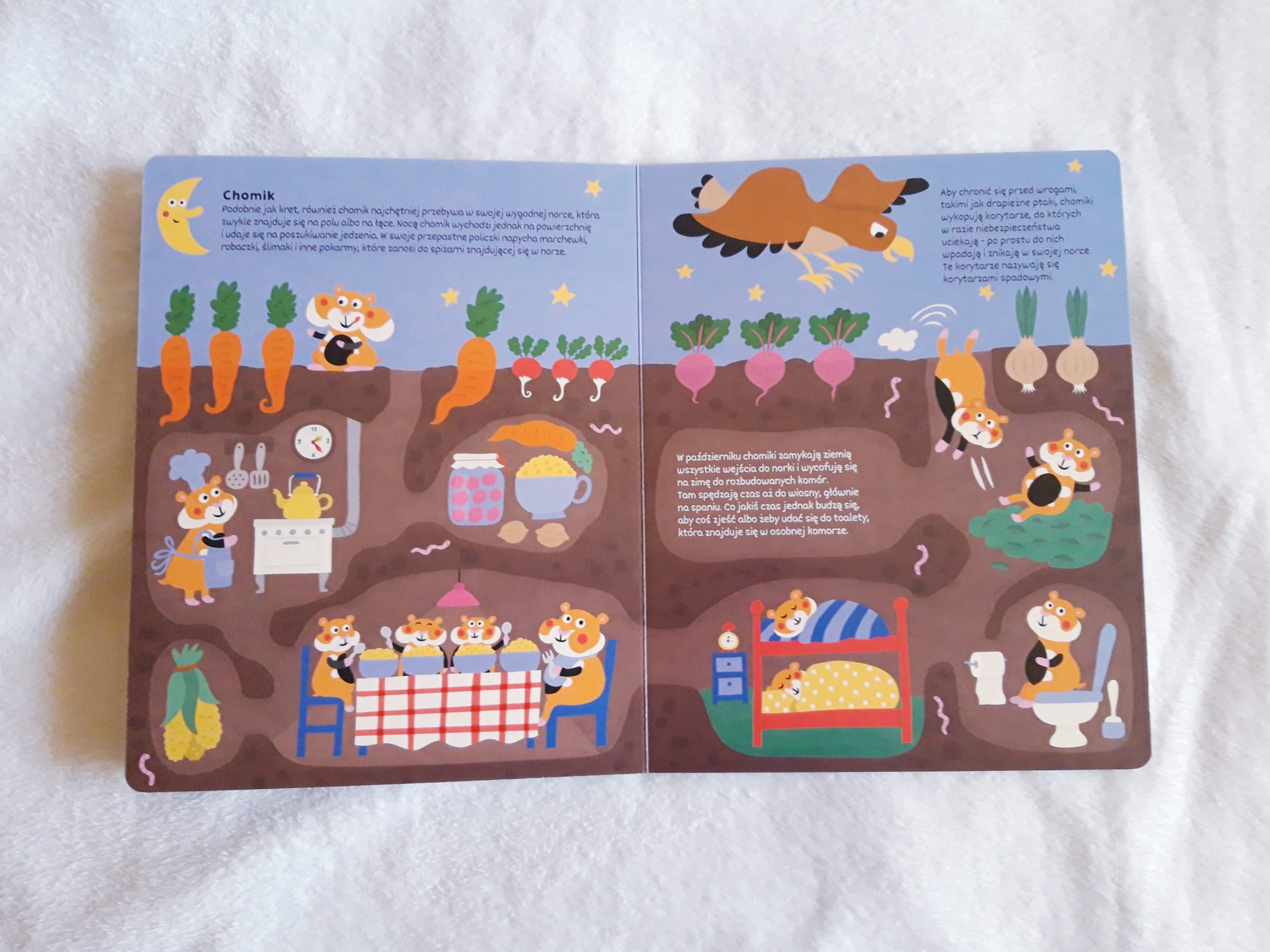 Książka ma format nieco większy niż A4 i ma twarde kartki, dzięki czemu nadaje się również dla maluchów, które z pewnością będą zachwycone kolorowymi ilustracjami pełnymi drobnych elementów i ciekawostek. Znajduje się w niej siedem dużych, podwójnych plansz, na których autorka umieściła przekrojowe ilustracje domów różnorodnych zwierząt. Można tu obejrzeć m.in. norki borsuków, królików, lisów, kretów i chomików. Nie zabrakło również zwierzątek żyjących nad wodą, takich jak bobry i wydry, a także tych pochodzących z gór, czyli świstaków.