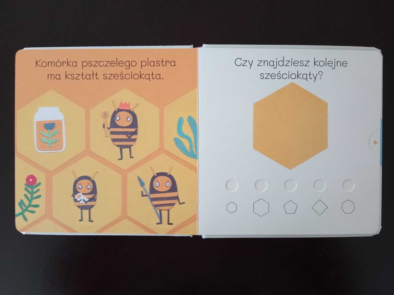 Mamy obrazek z pokazaniem kształtu a w sąsiedztwie prośbę o znalezienie kształtu wśród mini symboli. W kieszonkach stron ukryte są wewnętrzne kartoniki z przykładami, podpisanymi ilustracjami, reprezentantami danego kształtu w naszym otoczeniu. Po wysunięciu kartonika dziecko otrzymuje potwierdzenie prawidłowej odpowiedzi jako uśmiechniętej buźki. Nie zawsze oczywiste jest wskazanie prawidłowego kształtu, gdyż pojawiają się też kształty pod kątem przesunięte, co zgrabnie ćwiczy postrzeganie, spostrzegawczość, kojarzenie i odwzorowywanie.