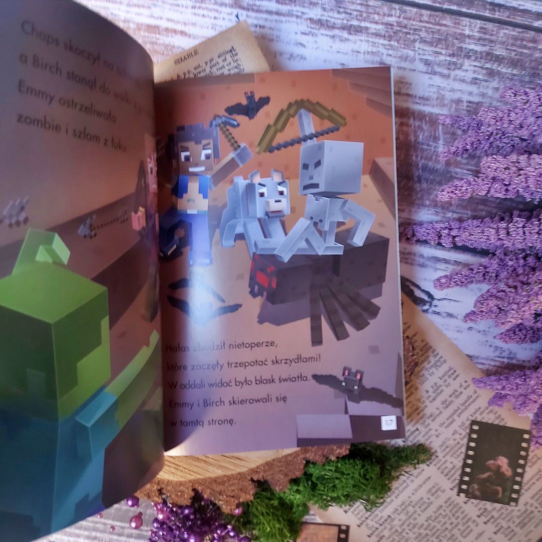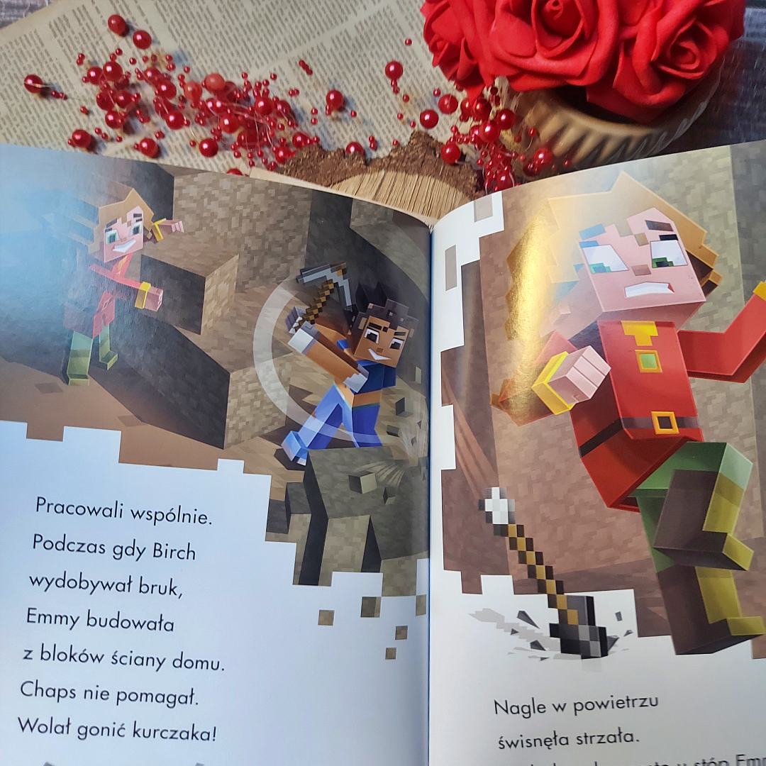 Kilka słów o tym, co poza wiedzą i nowymi możliwościami znaleźć możemy w poszczególnych książeczkach. Moby w świecie podstawowym to swoisty przewodnik po tym, co zawiera fauna Minecraftowego świata. Emmy, Birch i Chaps przeczesują świat w poszukiwaniu zwierzęcego przyjaciela dla Emmy. Podróż ta wcale nie okaże się taka łatwa, wszak miłośnicy Minecrafta doskonale wiedzą, że moby mogą być zarówno przyjazne, jak i wrogo do nas nastawione. Jakie zwierzątko stanie się tym ukochanym dla naszej łowczyni przygód. Musicie przekonać się sami. Ilustracje umilą wam tę przygodę. Jest niezwykle barwnie i klimatycznie. Od pierwszych stron dacie się porwać światu pełnemu dziwnych stworzeń i sześciennych bloków.