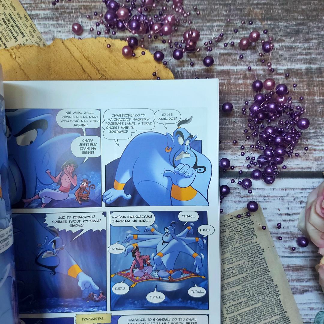 Chyba nikomu nie trzeba przedstawiać historii Aladyna i jego przyjaciół. Drobny złodziejaszek bawi pokolenia i również ja wracam do tej opowieści z sentymentem. Dzieciństwo spędzone w baśniowym Agrabahu, wśród piasków pustyni i morza barw zalewającego targi oraz wnętrza sułtańskich komnat było niepowtarzalną przygodą. Magia występowała jako dodatek działający jeszcze mocniej na wyobraźnie. Nic dziwnego, że Aladyn trafił do naszej biblioteczki i to w komiksowej wersji disnejowskich klasyków. Scenariusz okazał się krótką i jakże treściwą zarazem formą tej znanej historii. Zeszyt pełen przepięknych ilustracji wyjętych wprost z bajki to niesamowita przygoda dla młodszych czytelników, którzy zaczynają swoją podroż z taką formą rozrywki.