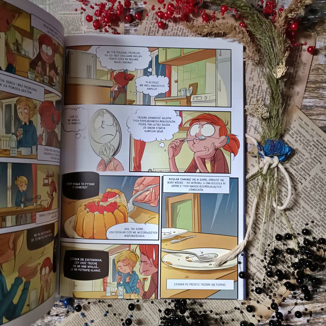 Bracia szantażyści to komiks detektywistyczny, który w ciekawy sposób wymyka się schematom i daje naprawdę sporą dawkę tajemnic i akcji. Mnóstwo tu grozy, niebezpieczeństw i równie wciągających postaci. Nie można nie wspomnieć o sporej dawce humoru i błyskotliwości panny Lomar. To historia, która wprowadza dzieci w ten nieco mroczniejszy obszar życia, równocześnie ucząc ich jak radzić sobie z problemami i gdzie szukać pomocy. Jestem ciekawa, jakie sprawy rozwiąże ta inteligentna nastolatka w kolejnych tomach. Pewne jest, że po raz kolejny wyciągnie pomocną dłoń w obronie słabszych i gnębionych. Powieści ilustrowane rosną w siłę, a ich moc przekazu stanowi dobrą podstawę do podejmowania coraz trudniejszych tematów. Piękna, wciągająca i pouczająca moc komiksów znowu ujęła nasze serduszka, te starsze i młodsze.