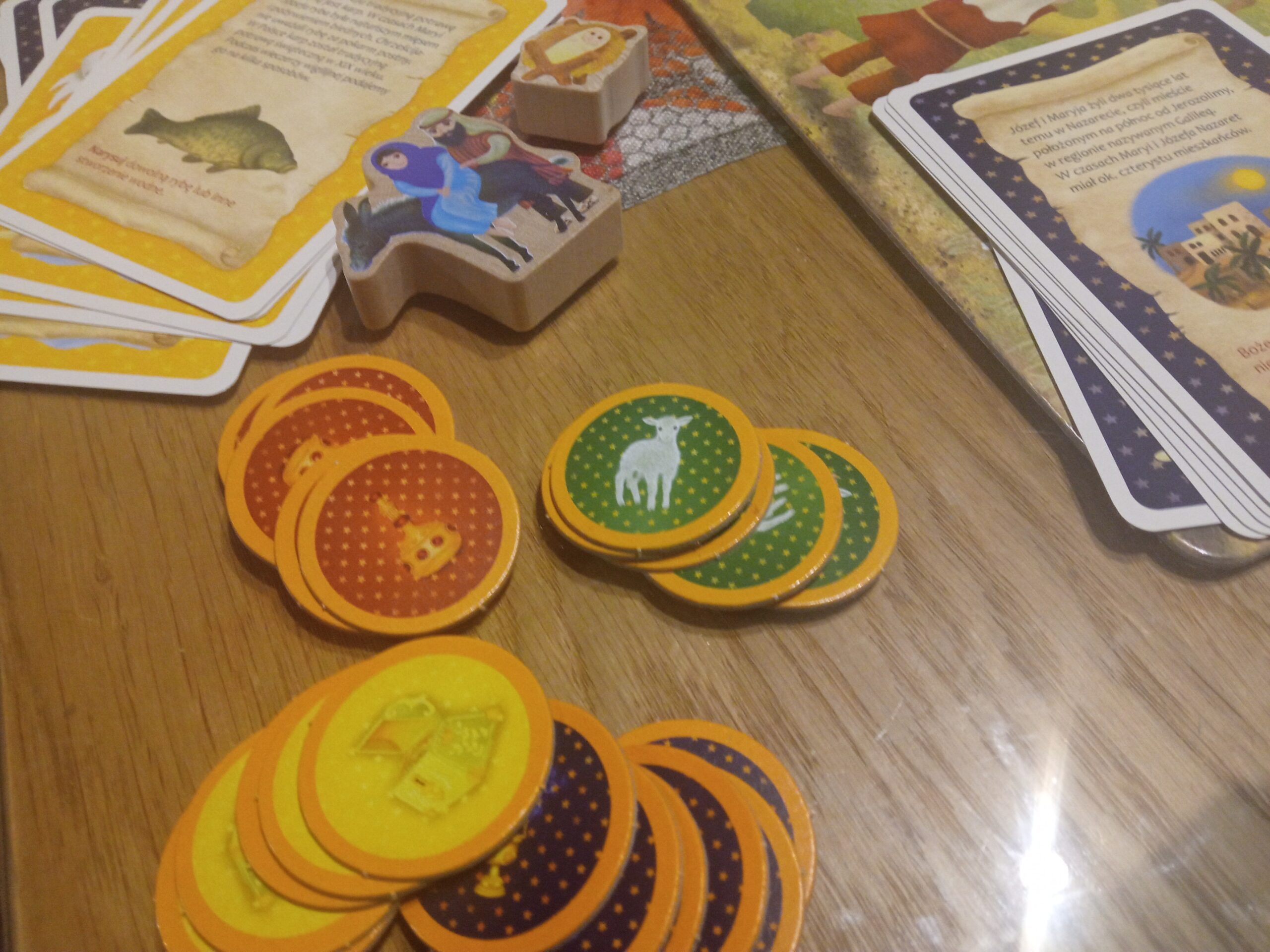 Usiadłam z córką do rozgrywki dwuosobowej, bo gra przewiduje taki scenariusz. Tu wygrywa się nie żetonami, a ilością anielskich kart, czyli ogromna losowość. Syn usiadł z nami, słuchał opowieści i odgadywał zagadki i miał z tego ogromną frajdę! W związku, z czym stworzyli zasadę, że nie gramy na punkty, po prostu jesteśmy razem w grze, zgadujemy nawzajem to, co karta każe zainscenizować i idziemy razem do żłóbka. Ewentualnie zbieramy punkty, ale na koniec i tak dajemy wszystkie. Da się. Jednak zastanawiam się, czy w grze, która ma nieść radość, faktycznie konieczny jest ten element rywalizacji, czy nie można było tego rozwiązać inaczej. Bo sama gra jest ciekawa, można się lepiej poznać, można się pośmiać. I wcale nie trzeba trzymać się Bożego Narodzenia. Ja na przykład wczoraj przy zwyczaju świątecznym pokazywałam święcenie pokarmu. Bo kto powiedział, że ma być prosto i jednoznacznie? To jest duży plus tej gry. Można grać z młodszymi dziećmi, w proste rozwiązania, a można mieć rzeczy z kosmosu. Bo to my wybieramy, jaką rzecz pokażemy, karta daje nam tylko ogólną wskazówkę.
