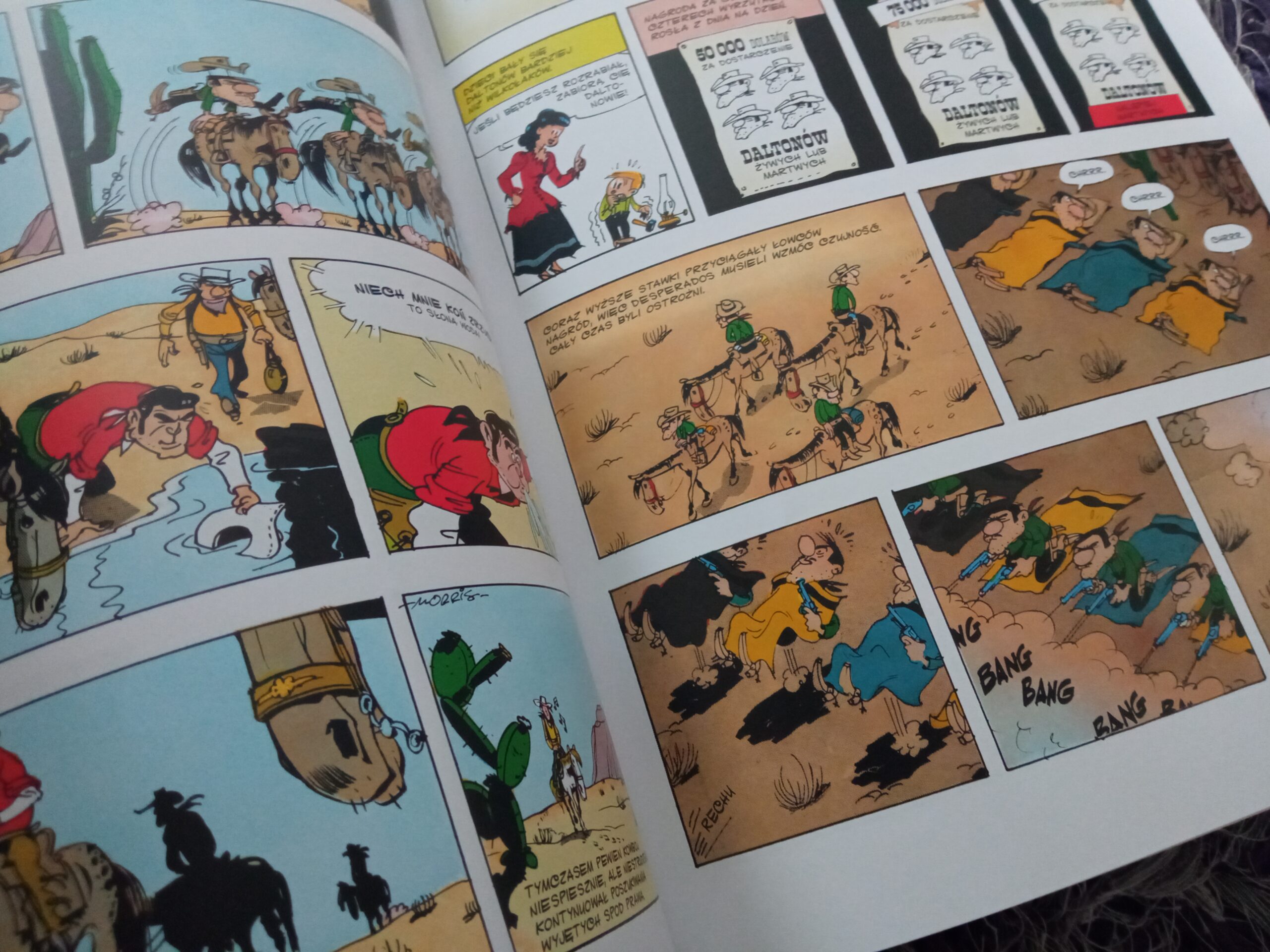 Scenariusz i rysunki w tym zeszycie opracował Morris. Oznacza to, że postacie nie są tak kanciaste, kreska jest delikatniejsza, kowboj grubszy i wszystko jest bardziej złagodzone. Zazwyczaj takie opowieści nie bardzo podobają się moim dzieciom. Przeszkadzają im te rysunki, nie mogą skupić się na treści. Jednak tym razem, ze względu na Daltonów, którzy nie są idiotami, a są bardzo wyraziści, przeczytali z przyjemnością, mniej zwracając uwagę na stronę graficzną.