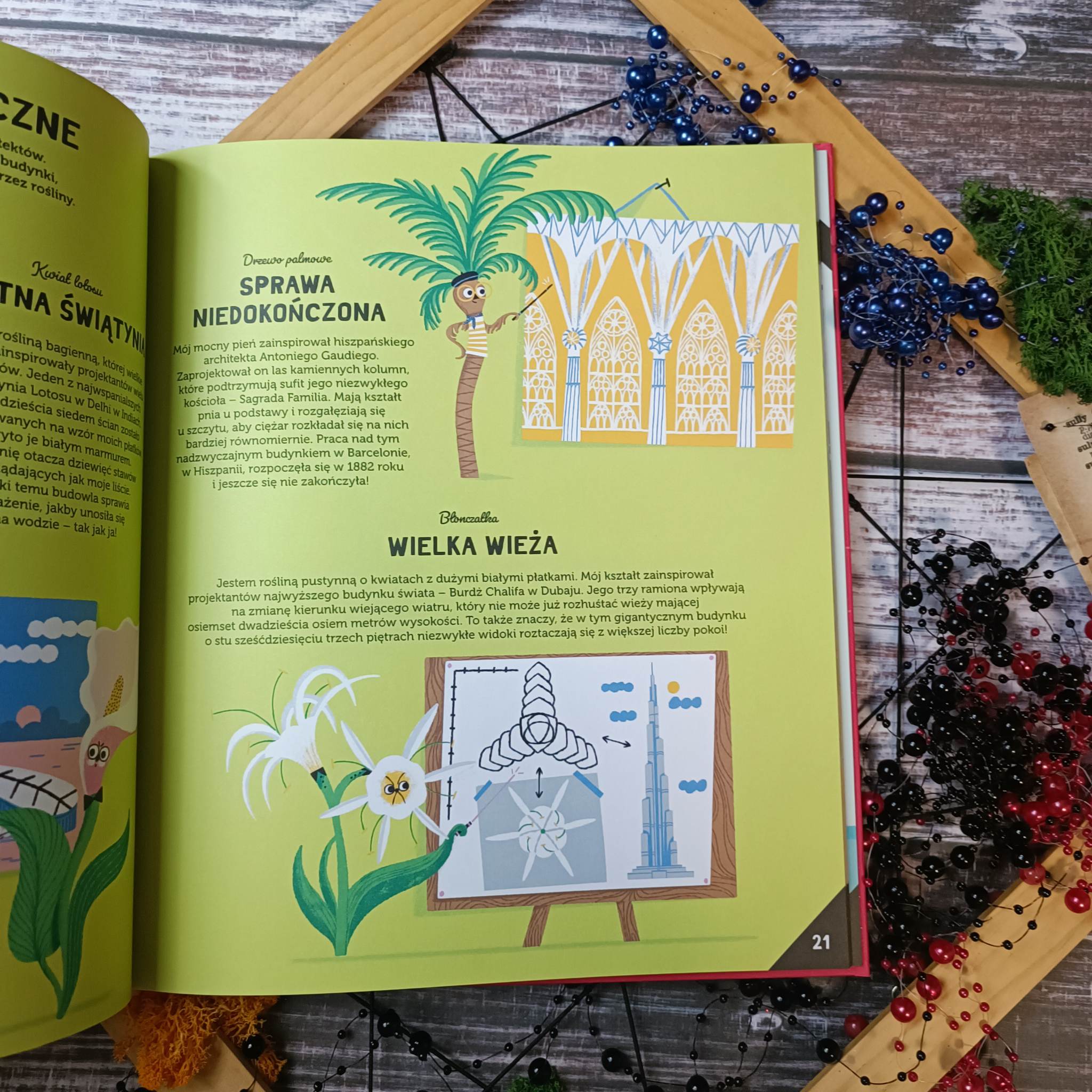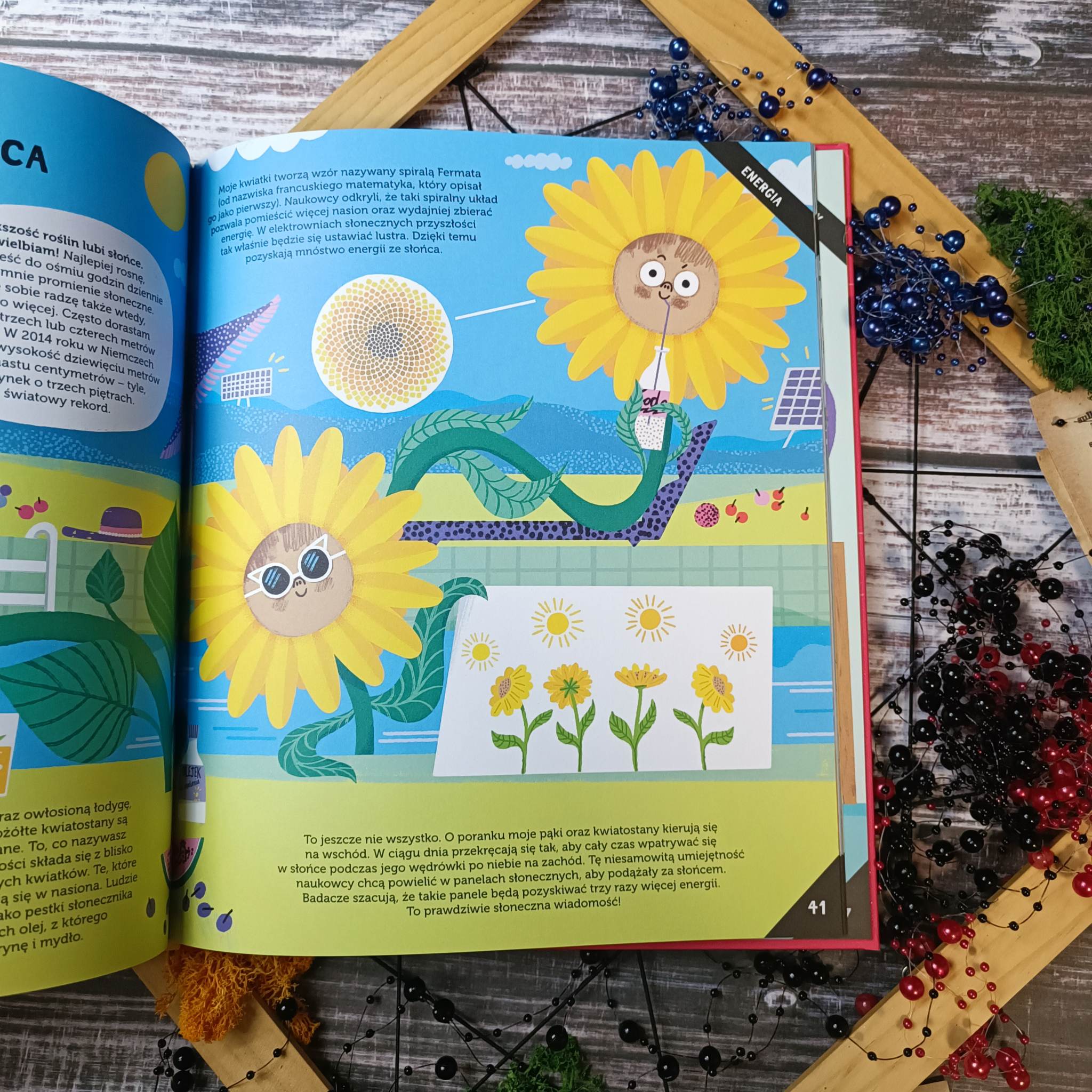 Wynalazki roślin otwiera przed dziećmi niesamowity świat pełen ciekawostek. Pozycja ta obejmuje szereg dziedzin, w których rośliny odcisnęły swoje piętno na długo. Po krótkim wstępie przechodzimy do magii skrywającej się na kartach książki stworzonej dla dzieci, lecz zaskakującej również dorosłego czytelnika. Nie brakuje tu ogromnej dawki wiedzy i ciekawostek, które wspomagane są niesamowitą szatą graficzną, jednak o tym później. Wynalazki roślin to inteligentnie rozplanowane informacje, które posegregowano ze względu na struktury, zastosowanie w robotyce, materiałach oraz w zdrowiu i energii, a także zrównoważonym rozwoju. Poznamy nie tylko ogólnodostępne rośliny jak Słonecznik, Len czy Eukaliptus, ale i Dziwidło olbrzymie, biegacz stepowy oraz Wiktoria królewska. Każda strona niesie za sobą fascynującą porcję wiedzy, która podana została w niezwykle przystępny sposób.