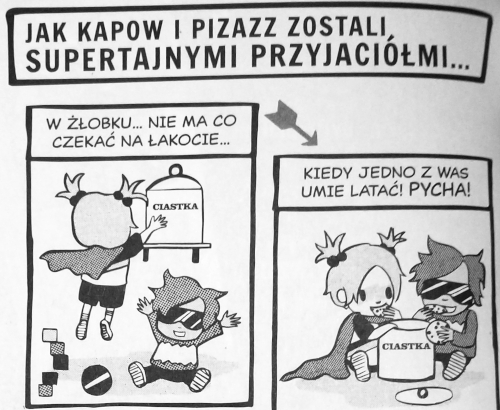 Pizazz to superbohaterka, która jak magnes przyciąga pechowe zdarzenia. Zwykle wybiera krótką słomkę wśród członków swojej rodziny i kończy pokryta paskudnymi płynami od walczących złoczyńców. Podobało mi się, że gdy staje przed wyzwaniem, zwraca się o pomoc. Jej historia pokazuje młodym czytelnikom, że praca zespołowa jest lepsza niż w pojedynkę, a wsparcie innych może otworzyć drzwi do większej liczby rozwiązań.