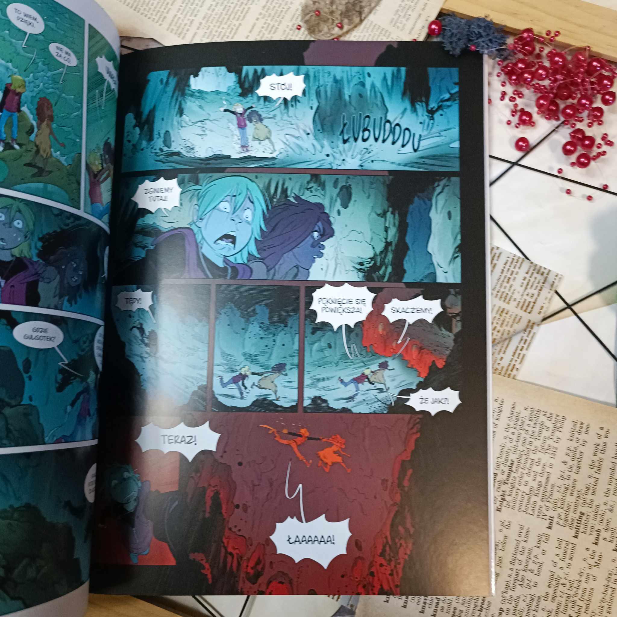 Każdy zeszyt z tej serii pokazuje, jak wiele można nauczyć się o życiu, gdy zmienimy perspektywę, choć na chwilę. Oczywiście nie potrzeba do tego podróży w czasie, choć ta w przypadku tego młodego buntownika sprawdza się świetnie. Poprzednie tomy miały podobną dynamikę i pozwalały na niespieszną rozrywkę, przypatrywanie się zmianom, jakie zachodzą w chłopcu. Mieszkanie w dżungli wśród roślin i zwierząt zmienia jego postrzeganie świata, a i ludzie powoli stają mu się bliżsi. Wybuch początkowo trzyma tempo poprzednich tomów. Wciąż jest zabawnie i pouczająco, a warstwa ilustracyjna jest niesamowita. Żywa, wielobarwna i dynamiczna. Tyle że za rogiem akcja przyspiesza, kolory nabierają głębi, a niebezpieczeństwo zdaje się równie ogromne, jak mamuty. Wybuch nabiera rozpędu i całość pochłania nas bez reszty. To jak do tej pory najlepszy zeszyt, a przecież wciąż tyle przygód przed nami.