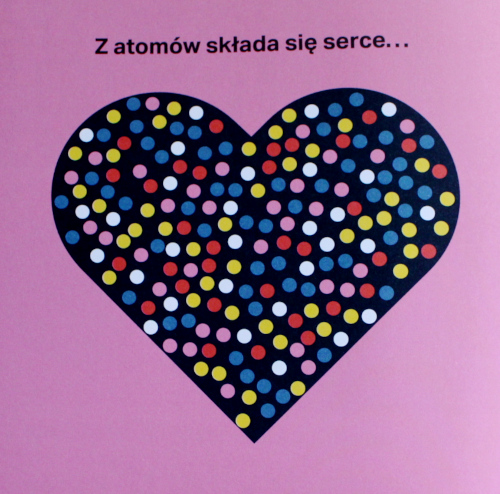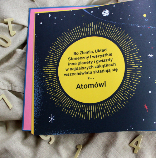 Ta niepozorna książka jest za to fantastycznie zilustrowana. W prostocie geometrycznych żywo kolorowanych wzorów i kształtów kryje się ich urok. Bardzo podobały mi się kolorowe kropki przedstawiające atomy. Każda strona kipi kolorami i nie ma ani jednego wolnego od nich miejsca w książce. Do tego nieco niestandardowy duży format pozwala zachwycać się rysunkom w pełni.