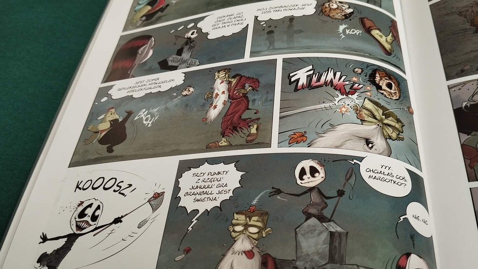 Humor. To po pierwsze i najważniejsze. Ten komiks po prostu nie może już być śmieszniejszy. Choć przyznać trzeba, że jest to humor dość makabryczny i czarny, a wspomniane już opisy robienia kanapek z trupów, czy instrukcja kopania grobu to normalność. Jednak ja taki humor kupuję. Co wrażliwsi jednak mogą nie zdzierżyć i im też radzę sięgnąć po inną lekturę. Bo o ile Margolka wygląda całkiem po ludzku, Zombiaczek też nie jest aż taki straszny (dziura w głowie jest praktycznie niedostrzegalna), to już reszta towarzystwa ma cechy typowych zombie. Wiecie, zieloność cery, odpadające kawałki ciała i takie tam przyjemności.