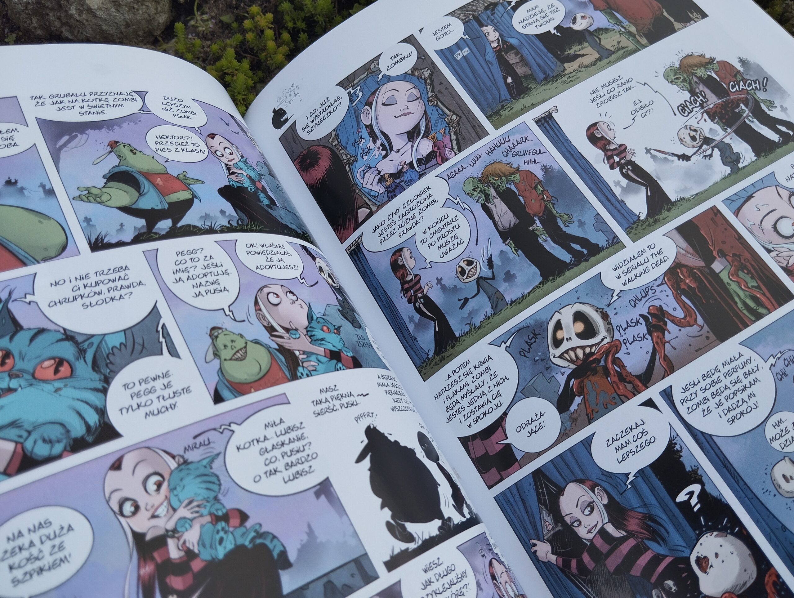 Nie rozumiem fenomenu „Zombiaczka”. Jest obrzydliwy, powodujący mdłości, nie dla ludzi o słabych nerwach, prześmiewczy i jeszcze kilka epitetów by się znalazło, ale jednak budzi zachwyt. Nie rozumiem, choć sama w niego wpadłam. Jak zresztą reszta mojej rodziny. Po przyjściu paczki „Zombiaczka” przechwytuje mąż. Nie czyta po kolei, raczej przerzuca strony i skupia się na tym, co go zainteresuje, ale i tak w efekcie czyta prawie całość, co chwilę wybuchając śmiechem. Po nim komiks przejmują dzieciaki i dopiero na szarym końcu ja mogę się zagłębić w lekturę.