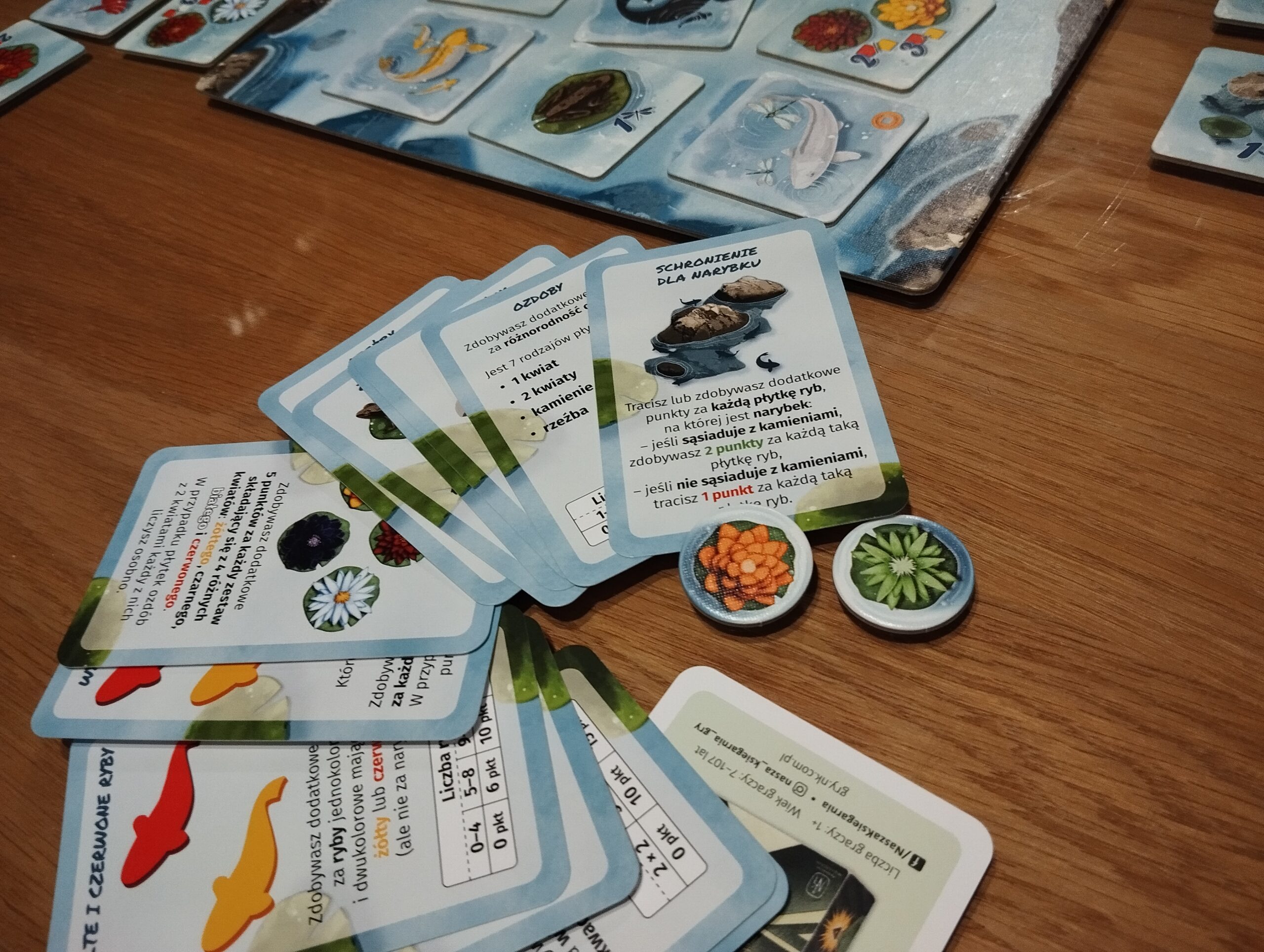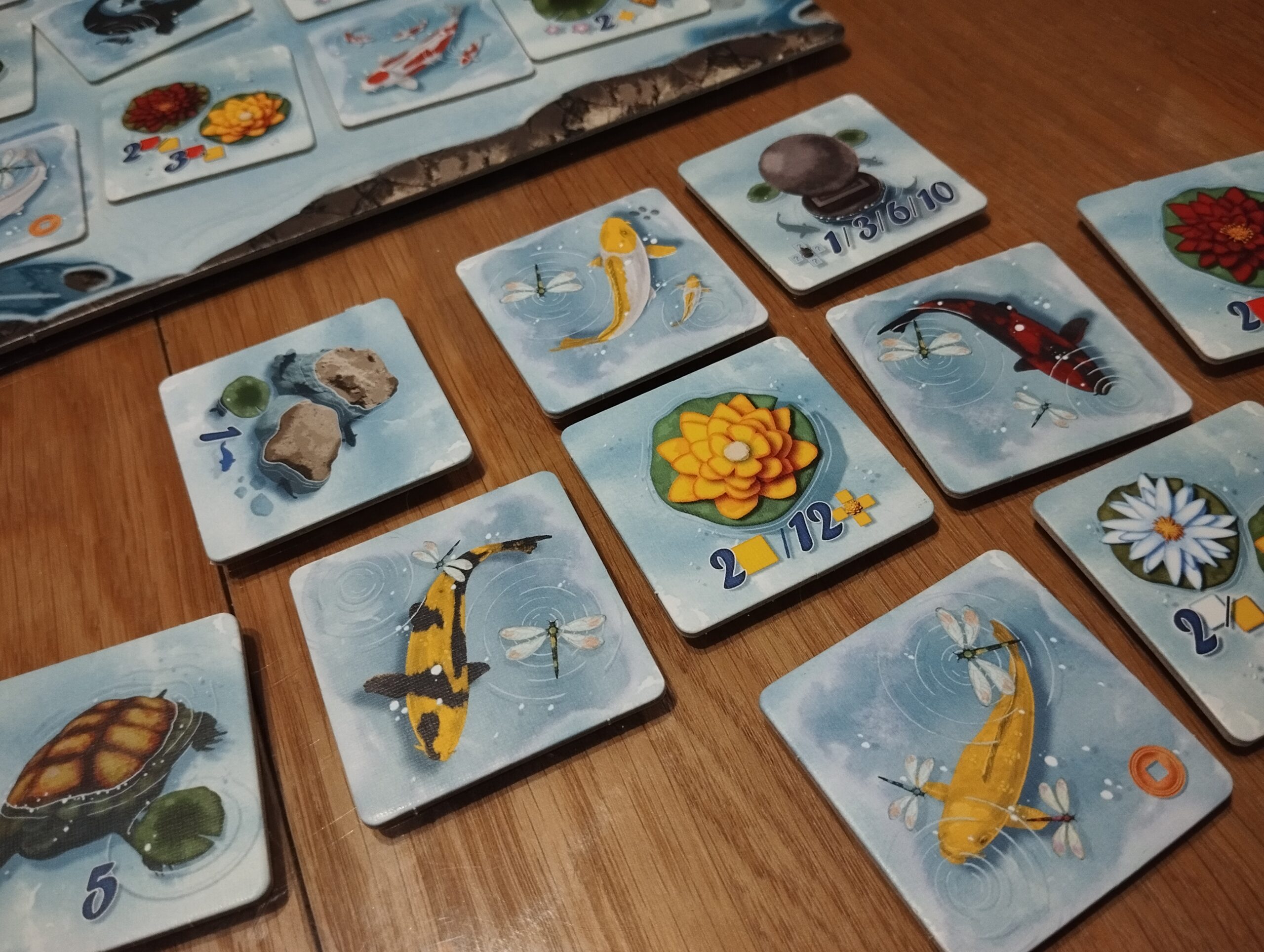 Rozgrywka trwa około trzydziestu pięciu minut, co czyni ją idealną na szybki relaks po długim dniu lub krótką przerwę między zajęciami. Gra należy do spokojnych, a mechanika opiera się na układaniu kafelków w taki sposób, by tworzyć harmonijny staw i zdobywać punkty za przemyślane kombinacje. Kafelki dzielą się na ryby i ozdoby, a ich wzajemne relacje – np. żaba obok ważki czy kamień chroniący narybek – wpływają na końcowy wynik. Na początku może się wydawać to skomplikowane, ale takie nie jest, a nawet, jeśli ktoś się pogubi – ściągawki pomagają.