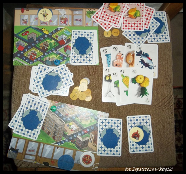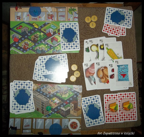 Gracze (2 – 4, w moim przypadku było dwóch graczy) wcielają się w właścicieli nowo otwartych pizzerii w czterech różnych dzielnicach (Biznesowa, Willowa, bohemy i biedoty), w których każda ma zróżnicowanych klientów. Aby nie było za łatwo, na otwarcie zaciągnęli kredyt, który trzeba spłacić pod czas trwania rozgrywki.