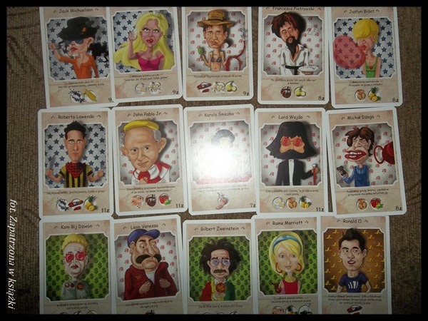 Jako że jestem wzrokowcem pierwsze na co zwracam uwagę, to wydanie. Pizza Wars pod tym względem ma swoje plusy oraz minusy, tych pierwszych jest na całe szczęście więcej. Podoba mi się to iż wszystkie cztery plansze (dzielnice) wyróżniają się grafikami (np. na biedoty znajdują się płonące samochody), są obustronne i trwałe. Równie mocne są żetony, które nie ulegną wygięciu czy przerwaniu. Najlepsze jednak są karty klientów z różnymi postaciami (po rysunkach oraz lekko zmienionych nazwiskach łatwo domyślić się, że wykorzystano do tego postacie znane z mass mediów) oraz składnikami z jakimi życzą sobie pizze. Minusem kart są właśnie małe rysunki składników i nawet osoba bez wady wzroku z większej odległości może mieć problem z rozpoznaniem. To samo tyczy się kart produktów, gdzie znak delikatesów jest mało rozpoznawalny. To jedyne mankamenty strony wizualnej gry i reszta jest rewelacyjna – przyjemna oraz łatwa do rozróżnienia.