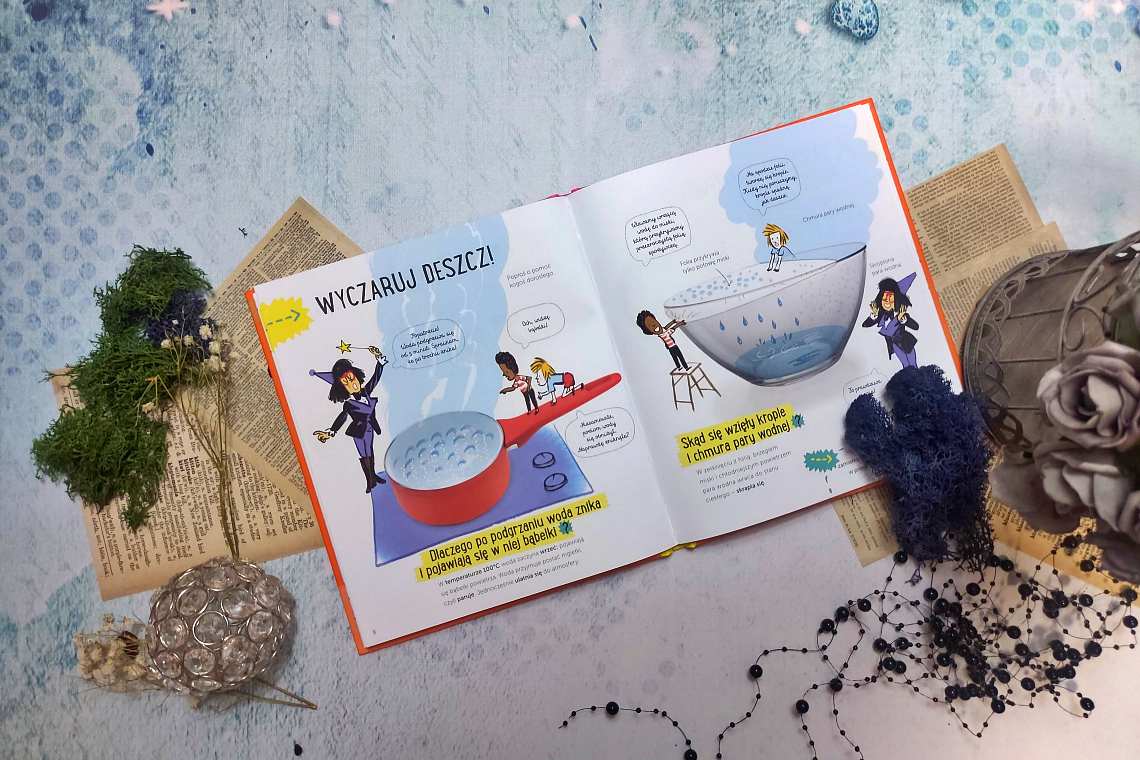 Wiedza zawarta w tej niewielkiej książeczce jest rzeczowa i przejrzyście podana. Dzieciom nic nie umknie, wręcz przeciwnie. Z zapałem podejdą do sprawdzania pozyskanej wiedzy i będą chciały więcej. Czy woda może być użyta jako klej? Może być jej więcej lub mniej? A może całkowicie znika? Mali odkrywcy zyskają odpowiedzi na te pytania, ale i dowiedzą się jak wyczarować deszcz i szybko opróżnić butelkę z wodą. To fantastyczna podróż, w którą warto wyruszyć wspólnie i cieszyć oczy pochłanianiem wiedzy przez nasze pociechy.