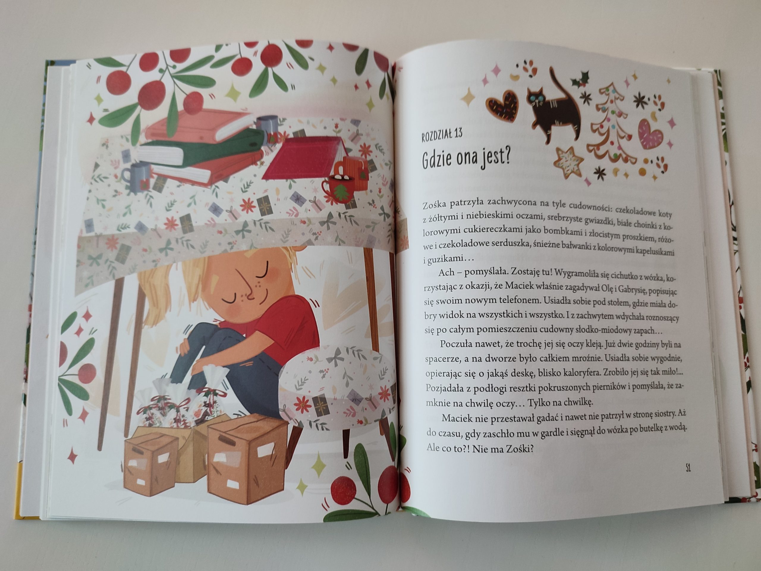 Książka Magdaleny Szczepańskiej została podzielona na dwadzieścia cztery rozdziały, dzięki czemu może być dobrą historią do czytania w grudniu, zresztą właśnie w tym czasie się zaczyna. W większości rozdziały nie są długie, idealne do przeczytania wieczorem do snu. Ale! Jest jeden problem: przeważnie kończą się tak, że ma się ochotę od razu czytać dalej. Dlatego proponuję, by po tę książkę jednak nie sięgać przed samym snem, lepiej dać sobie trochę czasu w zapasie, żebyście spokojnie mogli poczytać więcej. Książka została wydana w twardej oprawie z niewielkimi ilustracjami Kasi Nowowiejskiej i ozdobami, polecam czytać dzieciom starszym niż 3 lata, młodsze może znudzić taki stosunek tekstu do obrazków.