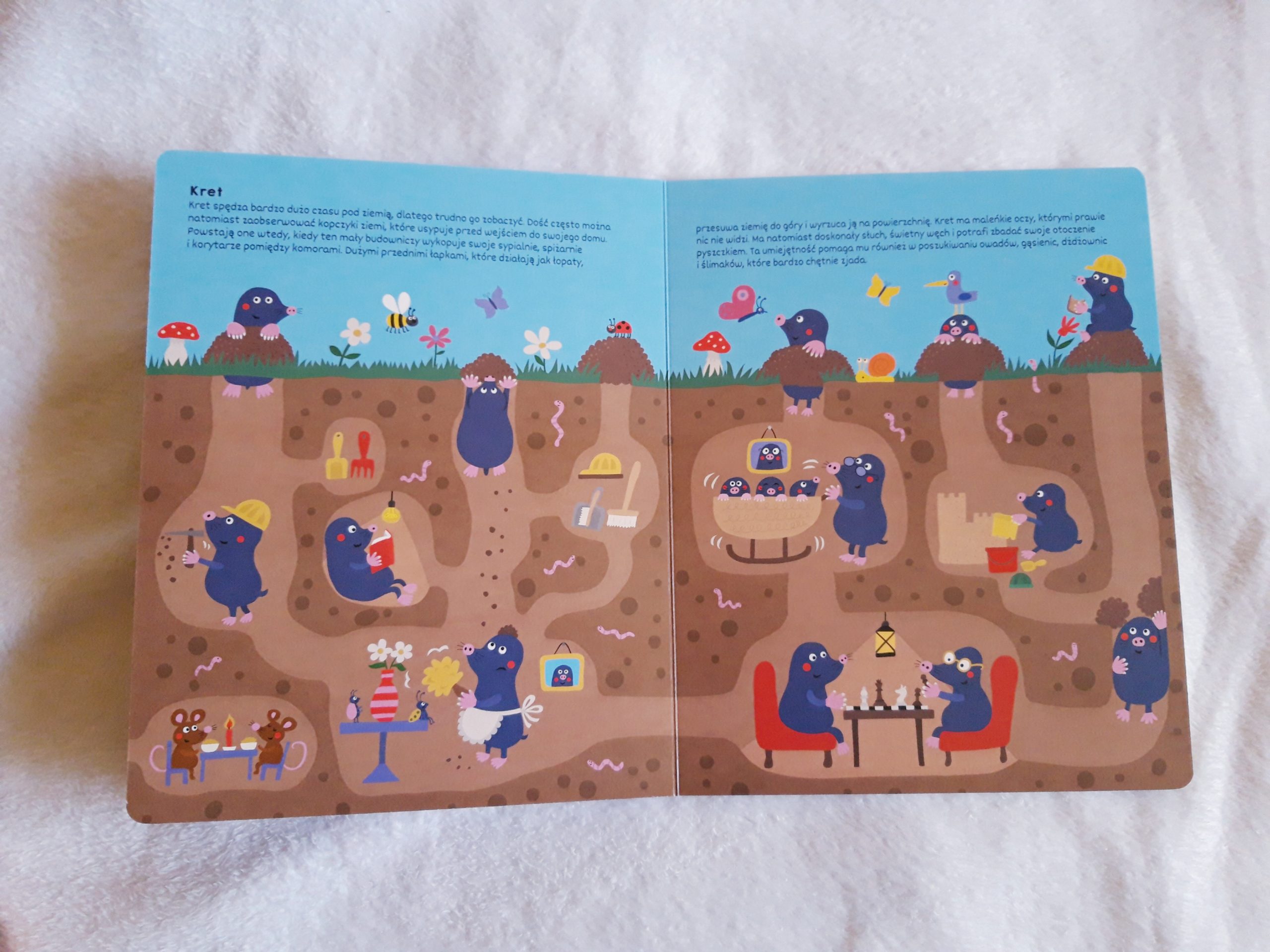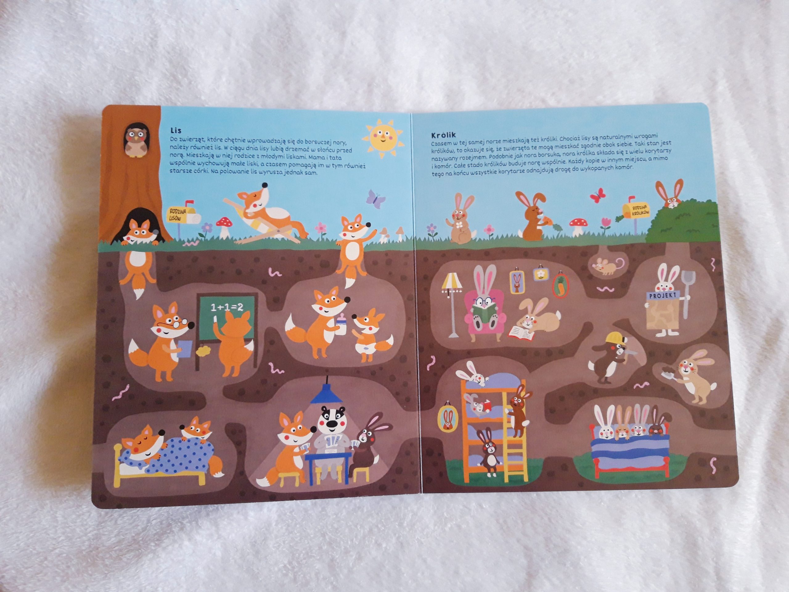 Książka ma format nieco większy niż A4 i ma twarde kartki, dzięki czemu nadaje się również dla maluchów, które z pewnością będą zachwycone kolorowymi ilustracjami pełnymi drobnych elementów i ciekawostek. Znajduje się w niej siedem dużych, podwójnych plansz, na których autorka umieściła przekrojowe ilustracje domów różnorodnych zwierząt. Można tu obejrzeć m.in. norki borsuków, królików, lisów, kretów i chomików. Nie zabrakło również zwierzątek żyjących nad wodą, takich jak bobry i wydry, a także tych pochodzących z gór, czyli świstaków.