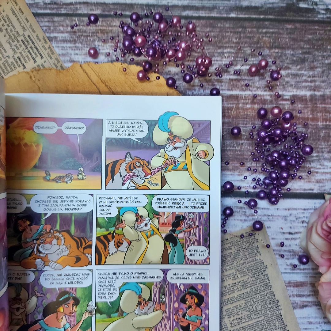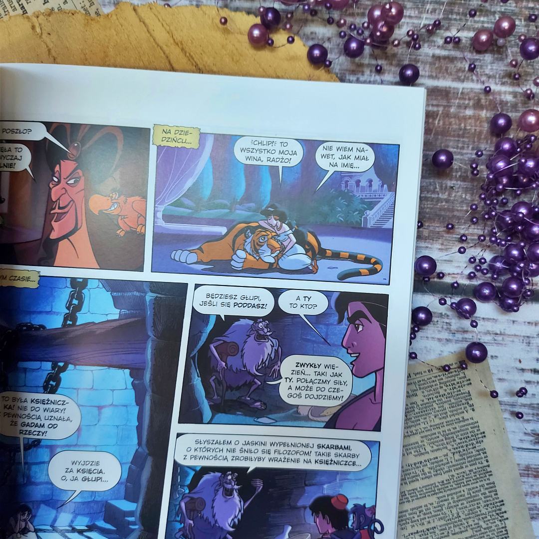 Chyba nikomu nie trzeba przedstawiać historii Aladyna i jego przyjaciół. Drobny złodziejaszek bawi pokolenia i również ja wracam do tej opowieści z sentymentem. Dzieciństwo spędzone w baśniowym Agrabahu, wśród piasków pustyni i morza barw zalewającego targi oraz wnętrza sułtańskich komnat było niepowtarzalną przygodą. Magia występowała jako dodatek działający jeszcze mocniej na wyobraźnie. Nic dziwnego, że Aladyn trafił do naszej biblioteczki i to w komiksowej wersji disnejowskich klasyków. Scenariusz okazał się krótką i jakże treściwą zarazem formą tej znanej historii. Zeszyt pełen przepięknych ilustracji wyjętych wprost z bajki to niesamowita przygoda dla młodszych czytelników, którzy zaczynają swoją podroż z taką formą rozrywki.