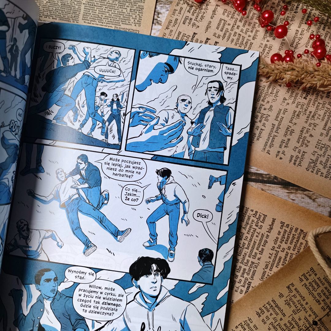 To, czego słowa nie odkryją od razu, ilustracje obnażą z prędkością światła. Zabawa barwą, zmienna kreska i rozdzielenie dwóch światów podkreśla nie tylko emocje, ale i moc zmian, jakie zachodzą w młodym Graysonie. Zaginione wesołe miasteczko to niesamowita kreska, która miękko podkreśla klimat powieści i charakter bohaterów. Dwa przeważające kolory, które symbolizują dwie strony medalu, sprawdzają się świetnie, są pomocne w uszeregowaniu wydarzeń, postaci i emocji. Całość jest lekka i przyjemna w odbiorze.