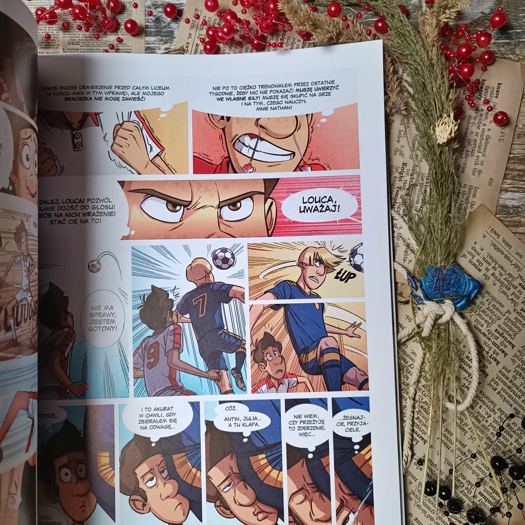 Trzecia odsłona serii o niezgrabnym chłopcu, który chce zostać piłkarzem i wzorem dla swojego młodszego brata, oraz ducha, który z jakiegoś powodu nawiedza mury szkoły. Przygody tych dwóch jakże różnych osobowości kupiły naszą uwagę już pierwszym zeszytem. Nieszablonowa fabuła i pełna humoru akcja, która nie pozwala odłożyć komiksu do samego końca. To historia z rzędu tych nieodkładanych i niosących za sobą przekaz o tyle uniwersalny, że nie ma płci czy wieku. Louca chce odmienić swoje życie i pomimo wszelkich przeszkód z każdą stroną udaje mu się coraz więcej. To z pewnością pokłosie regularnych treningów z Nathanem, który powoli przestaje być dla nas zagadką. Relacja tej dwójki jest niezwykła i opiera się na przeciwieństwach. Dzięki temu mały czytelnik bez problemu odkryje, co autor miał na myśli.