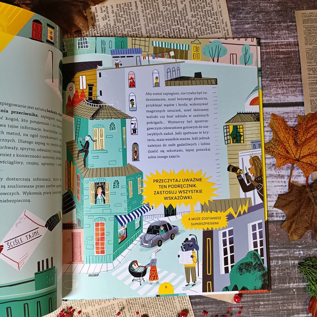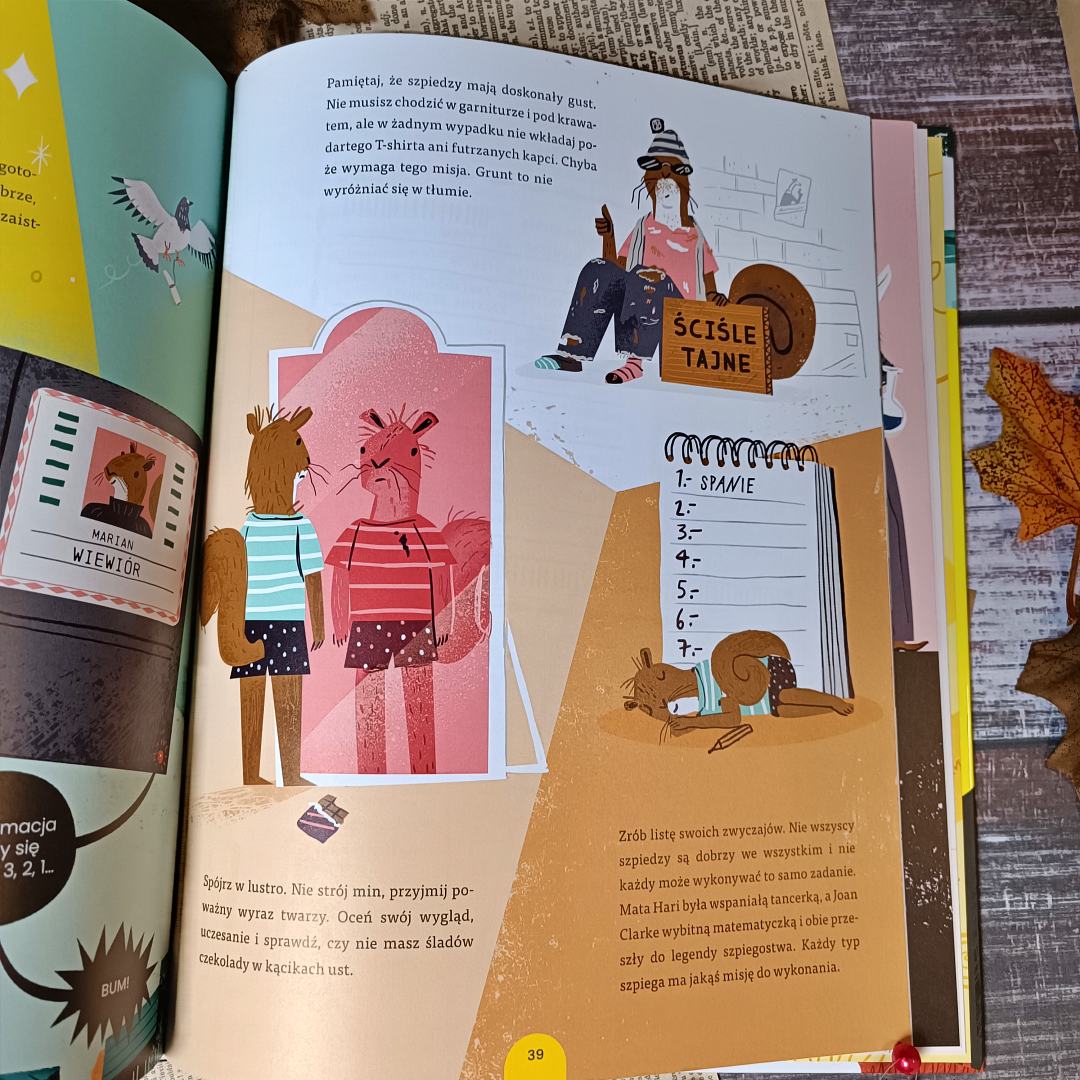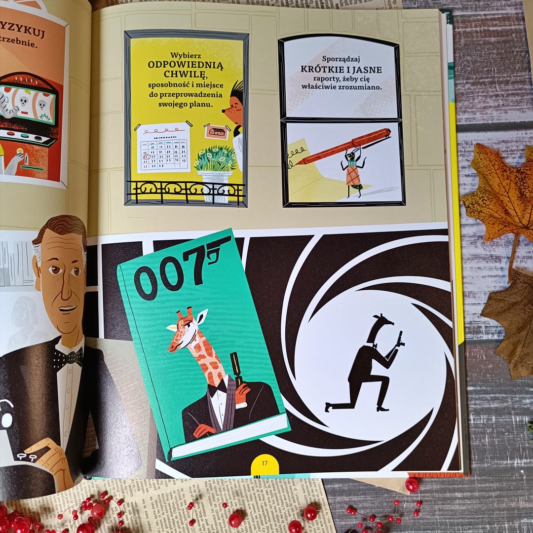 Jak zostać szpiegiem to nie tylko anegdotki, ciekawostki i fascynujące historie, ale także pełne genialnej aury ilustracje. Są zabawne, fascynujące i kolorowe. Ich komiksowy charakter przyciąga wzrok i ułatwia przyswajanie wiedzy skrywającej się w krótkich tekstach. Zapewne aura tajemniczości unosi się nad całością dzięki specyfice tematu, ale i ilustracje odgrywają w tym procesie ogromną rolę. Kreska przykuwa uwagę i pozwala wczuć się w czytane opowieści jeszcze mocniej. Nie brakuje tu ruchu, akcji i barw. Sporo czasu spędzicie przy przyglądaniu się każdej kresce i będzie warto.
