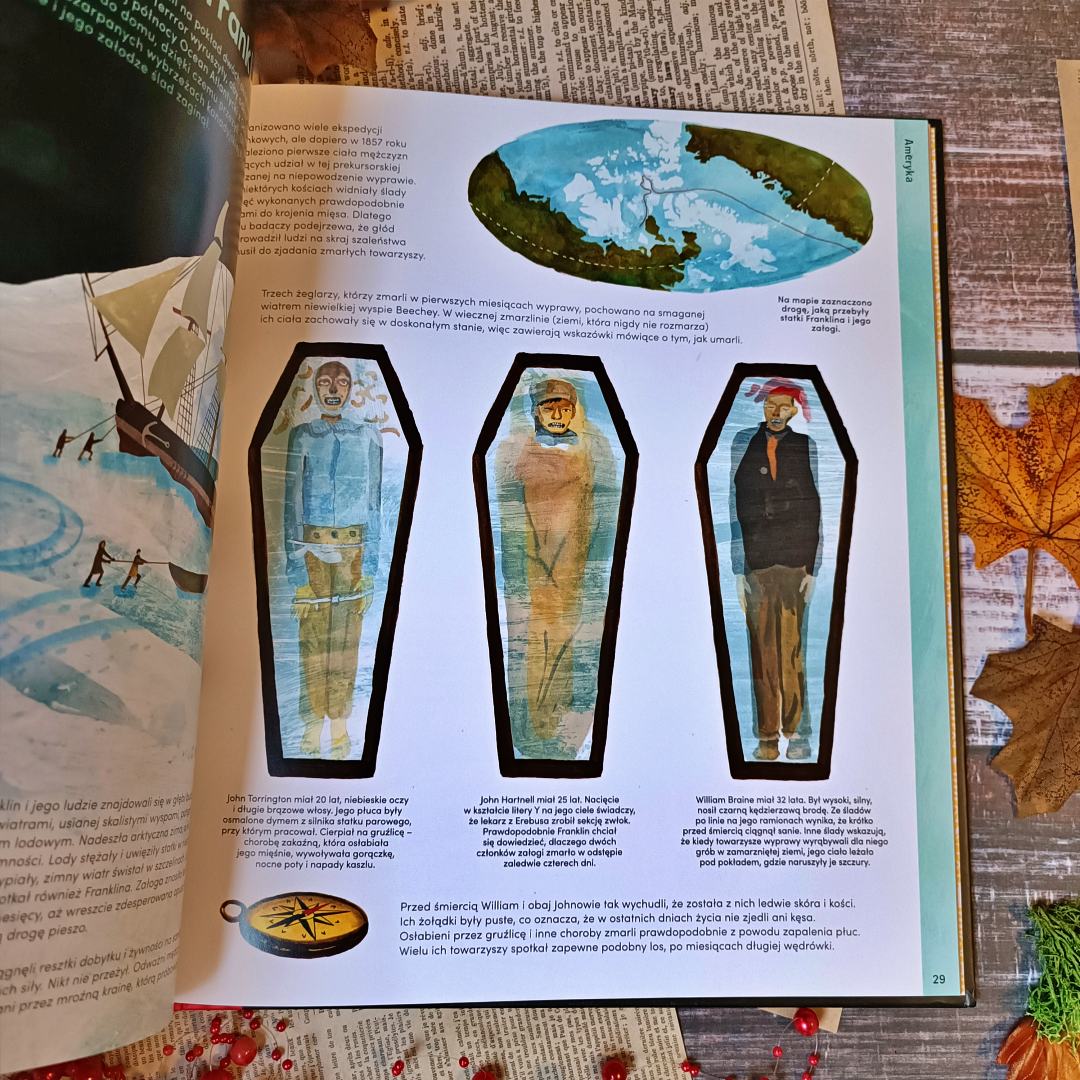 Sekrety zmarłych uświadamiają naturalność samej śmierci i tego, co dzieje się z ciałem ludzkim. Bardzo ciekawie i prosto wyjaśniono, jak zmarli mogą pomóc w rozwoju medycyny, ale i przedstawieniu formy danej cywilizacji na przestrzeni wieków. Ilustracje w przypadku tego tytułu są niezbędny elementem, który jednak może nie spodobać się każdemu. Przyciągają wzrok i świetnie uzupełniają poruszane tematy. Dzięki publikacji dowiemy się, dlaczego pochówek różnił się w cywilizacjach czy klasach społecznych. Kto dbał o szczątki, a komu zdarzało się składać je w ofierze. Na plus zasługuje piękne wykonanie, twarda oprawa, mocno zszyte strony i świetnie dobrana kolorystyka, która pozwala wczuć się w przytaczane opowieści.