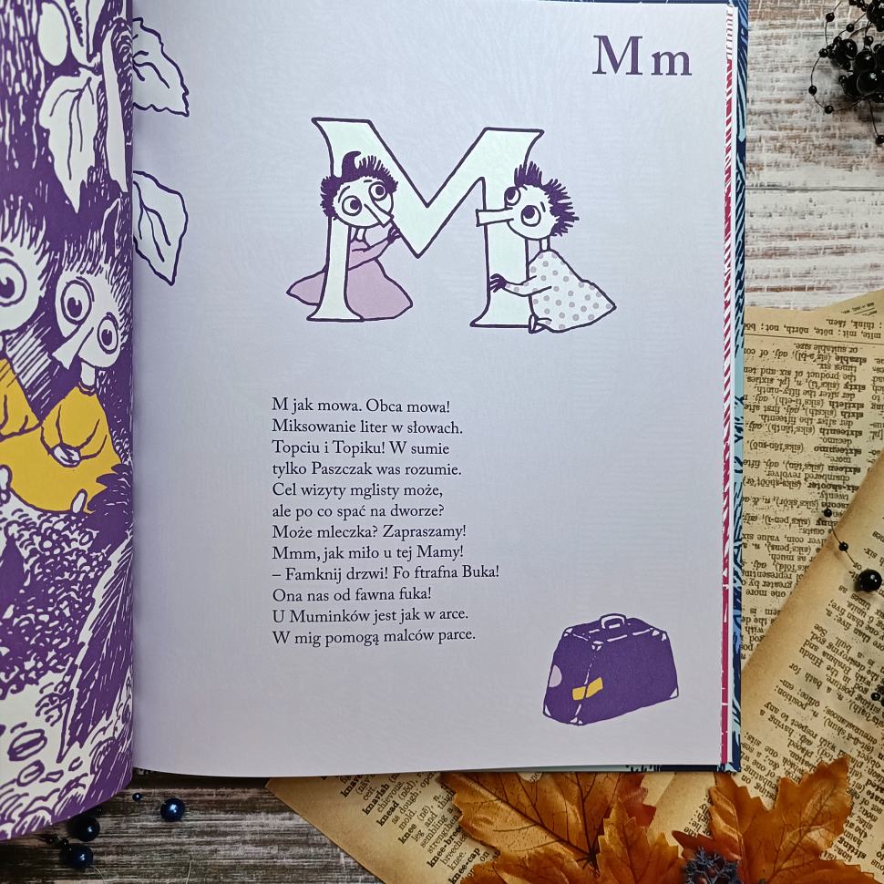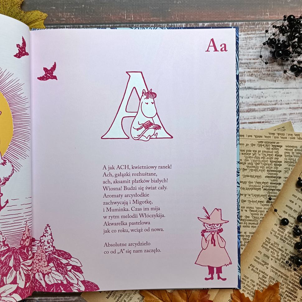 Muminki. ABC to gratka dla miłośników skandynawskich postaci. Każdy rodzic doceni jednak przejrzystość, prostotę każdej rymowanki i piękno kreski, która umila poznawanie literek. Całość można poznawać na wiele sposobów i długo cieszyć się lekturą i wiedzą, jaką nam przekazuje. Od teraz alfabet nam niestraszny. Nauka może być zabawna i przyjemna, no i długotrwała, gdyż jest to publikacja wykonana z dbałością o szczegóły i jakość. Z Muminkami nauka literek będzie czystą frajdą.