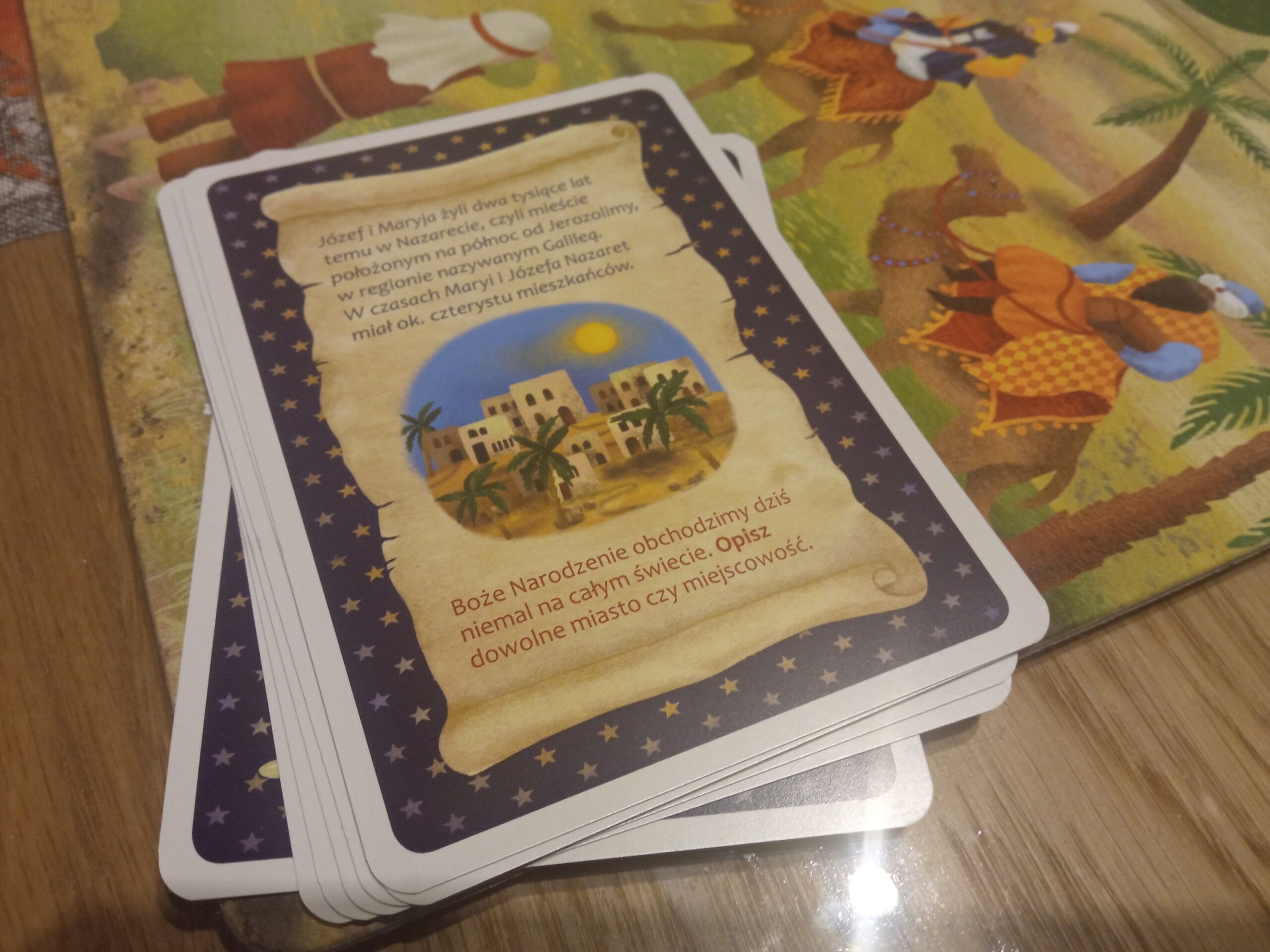 Usiadłam z córką do rozgrywki dwuosobowej, bo gra przewiduje taki scenariusz. Tu wygrywa się nie żetonami, a ilością anielskich kart, czyli ogromna losowość. Syn usiadł z nami, słuchał opowieści i odgadywał zagadki i miał z tego ogromną frajdę! W związku, z czym stworzyli zasadę, że nie gramy na punkty, po prostu jesteśmy razem w grze, zgadujemy nawzajem to, co karta każe zainscenizować i idziemy razem do żłóbka. Ewentualnie zbieramy punkty, ale na koniec i tak dajemy wszystkie. Da się. Jednak zastanawiam się, czy w grze, która ma nieść radość, faktycznie konieczny jest ten element rywalizacji, czy nie można było tego rozwiązać inaczej. Bo sama gra jest ciekawa, można się lepiej poznać, można się pośmiać. I wcale nie trzeba trzymać się Bożego Narodzenia. Ja na przykład wczoraj przy zwyczaju świątecznym pokazywałam święcenie pokarmu. Bo kto powiedział, że ma być prosto i jednoznacznie? To jest duży plus tej gry. Można grać z młodszymi dziećmi, w proste rozwiązania, a można mieć rzeczy z kosmosu. Bo to my wybieramy, jaką rzecz pokażemy, karta daje nam tylko ogólną wskazówkę.