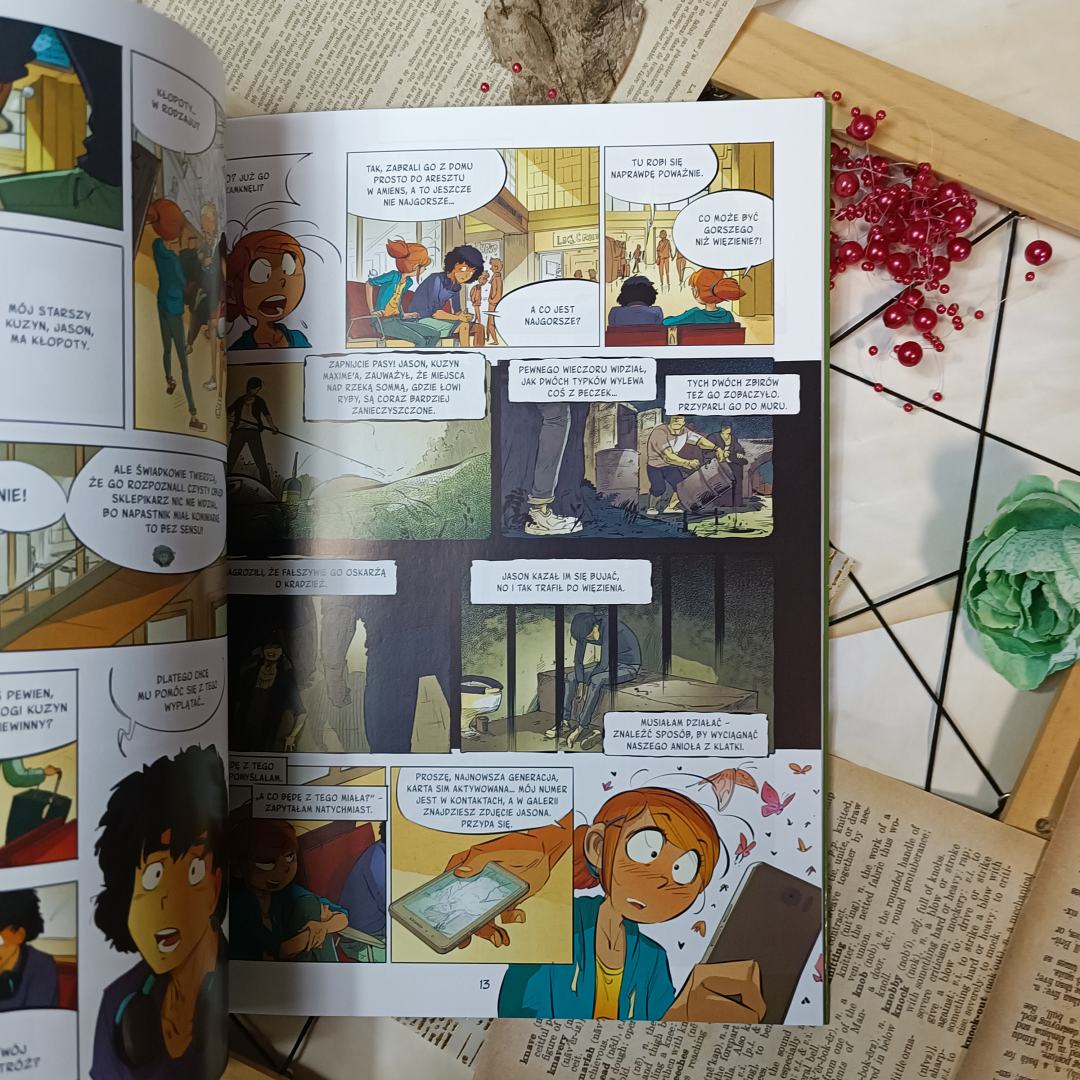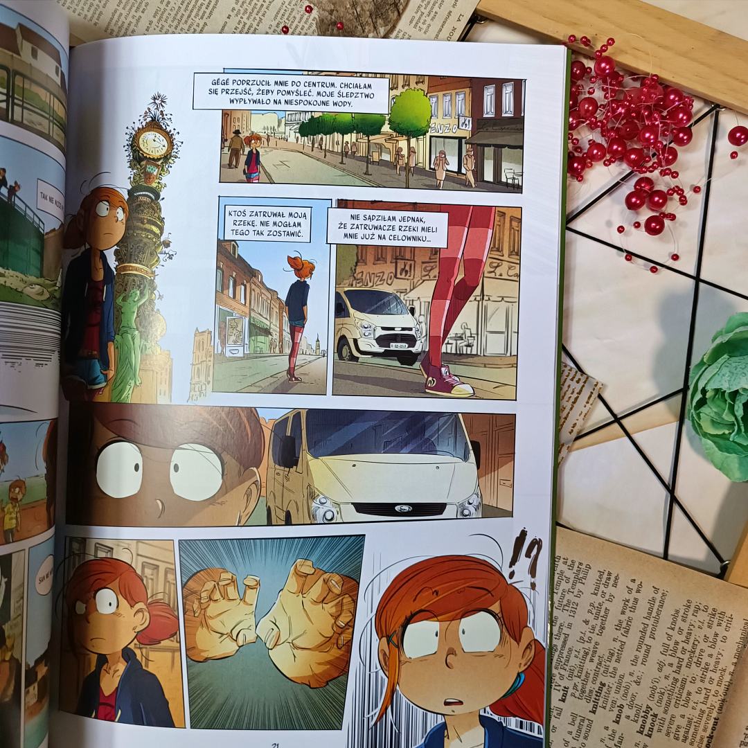 Trzecia odsłona cyklu zaskakuje poziomem niebezpieczeństwa i grą cieni. Dużo więcej tu ciemnych kadrów, które podkreślają powagę samej sprawy, ale i również fakt zanieczyszczania rzeki. Ten temat poruszono połowicznie, a jednak mocno trafia w czytelnika, który chce dowiedzieć się, jak zapobiegać takim sytuacjom. Do tego Filipina nagle nam dorasta i staje się w naszych oczach kimś poważniejszym a równocześnie podatniejszym na zło. Zresztą jej sprawy stają się coraz bardziej niebezpieczne, na szczęście ma wsparcie wuja i specyficzną przyjaźń z Mokiem. Jej postawa zachwyca z każdym kolejnym tomem. Zatruta woda odsłania inną naturę dziewczyny i sprawia, że mocniej ją lubimy.