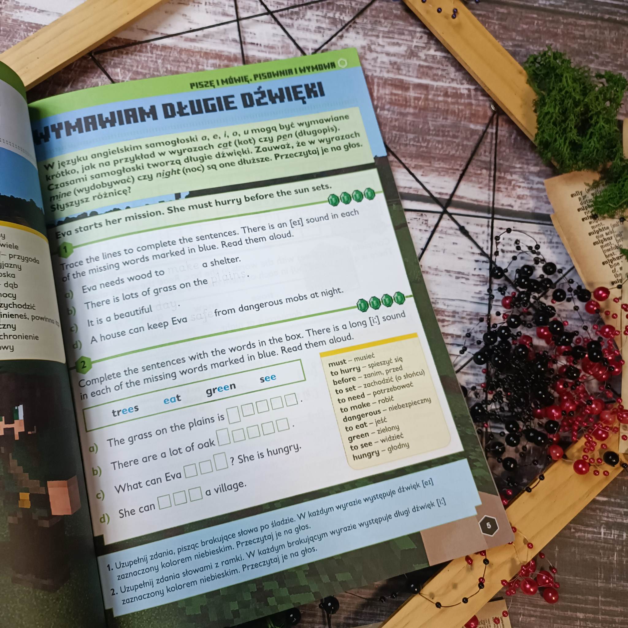 Poznawanie nowych krain to pasja Evy, która i w tym zeszycie wraz z Tomem będzie towarzyszyć naszemu małemu odkrywcy. Skoro już znamy się z typem zadań, które prowadzą nas przez tę przygodę, to zwiększmy jej trudność. Wyższy poziom trudności zadań oznaczony jest serduszkiem. Podobnie jak w poprzednim zeszycie na początku zajmiemy się pisownią i wymową, a gdy przygoda zacznie nas wciągać pojawią się kolejne wyzwania. Budowanie różnych typów zdań, czasowniki, opisywanie czynności i rzeczy, pisanie wierszy i dokumentowanie faktów, tworzenie scenariuszy i wiele więcej. To wszystko w otoczeniu przeróżnych biomów i postaci ze świata Minecraft.