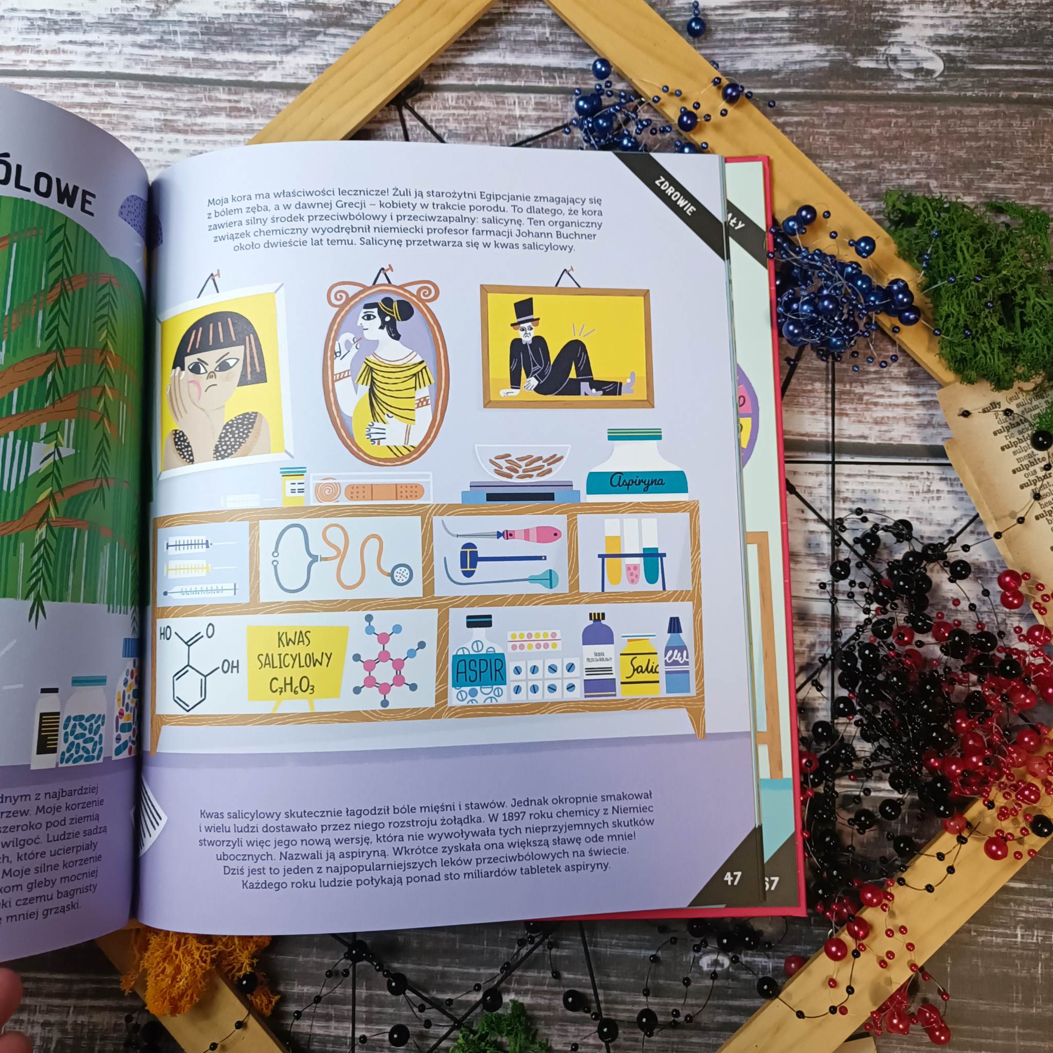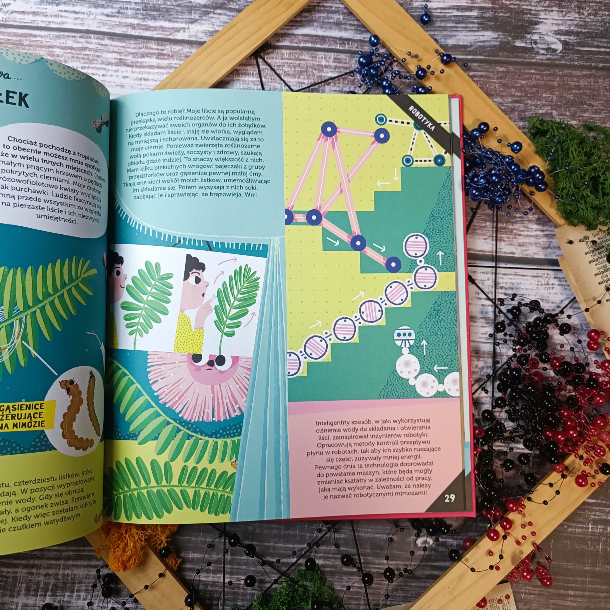 Wynalazki roślin otwiera przed dziećmi niesamowity świat pełen ciekawostek. Pozycja ta obejmuje szereg dziedzin, w których rośliny odcisnęły swoje piętno na długo. Po krótkim wstępie przechodzimy do magii skrywającej się na kartach książki stworzonej dla dzieci, lecz zaskakującej również dorosłego czytelnika. Nie brakuje tu ogromnej dawki wiedzy i ciekawostek, które wspomagane są niesamowitą szatą graficzną, jednak o tym później. Wynalazki roślin to inteligentnie rozplanowane informacje, które posegregowano ze względu na struktury, zastosowanie w robotyce, materiałach oraz w zdrowiu i energii, a także zrównoważonym rozwoju. Poznamy nie tylko ogólnodostępne rośliny jak Słonecznik, Len czy Eukaliptus, ale i Dziwidło olbrzymie, biegacz stepowy oraz Wiktoria królewska. Każda strona niesie za sobą fascynującą porcję wiedzy, która podana została w niezwykle przystępny sposób.