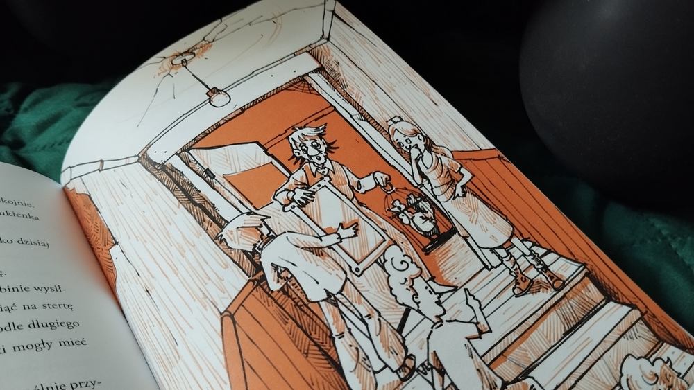 Tę książkę czyta się na jednym wdechu. Naprawdę. Od samego początku akcja wciąga i nie pozwala odłożyć czytania na później. Dobrze, że stron nie jest za dużo i jeszcze treść jest poprzetykana obrazkami, bo czytelnik niechybnie by się udusił z emocji, strachu i braku tlenu. A teraz poważnie. Książka faktycznie jest niepozorna, a napakowana zdarzeniami od pierwszej i ostatniej strony. Ciągle coś się dzieje, nie ma czasu na nudę, wydarzenie goni wydarzenie. Wszystko to dodatkowo zilustrowane tak, że budzi jeszcze większe emocje, choć rysunki są proste, wykorzystują tylko trzy kolory, ale podsycają grozę opowieści.