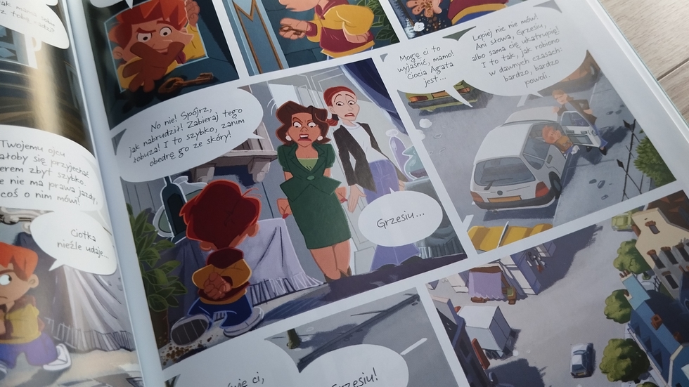 Bardzo podoba mi się fabuła, już od pierwszego tomu spójna, teraz pokazuje tylko kolejne rzeczy, odkrywa następne karty. Ciągle się coś dzieje, akcja jest dość szybka, czasem, jak Grześ, się za nią nie nadąża, ale to jeszcze bardziej pozwala się wczuć w sytuację bohatera. Kolejne wydarzenia są dobudowywane, wiedza odsłania się powoli. Tu warto też wspomnieć o kolorach, dzięki którym nie gubimy się w czasie. Każdy czas ma bowiem swoją własną paletę, dzięki której możemy się od razu zorientować, że Grześ podróżuje, bo nie zawsze wynika to od razu z kontekstu.
