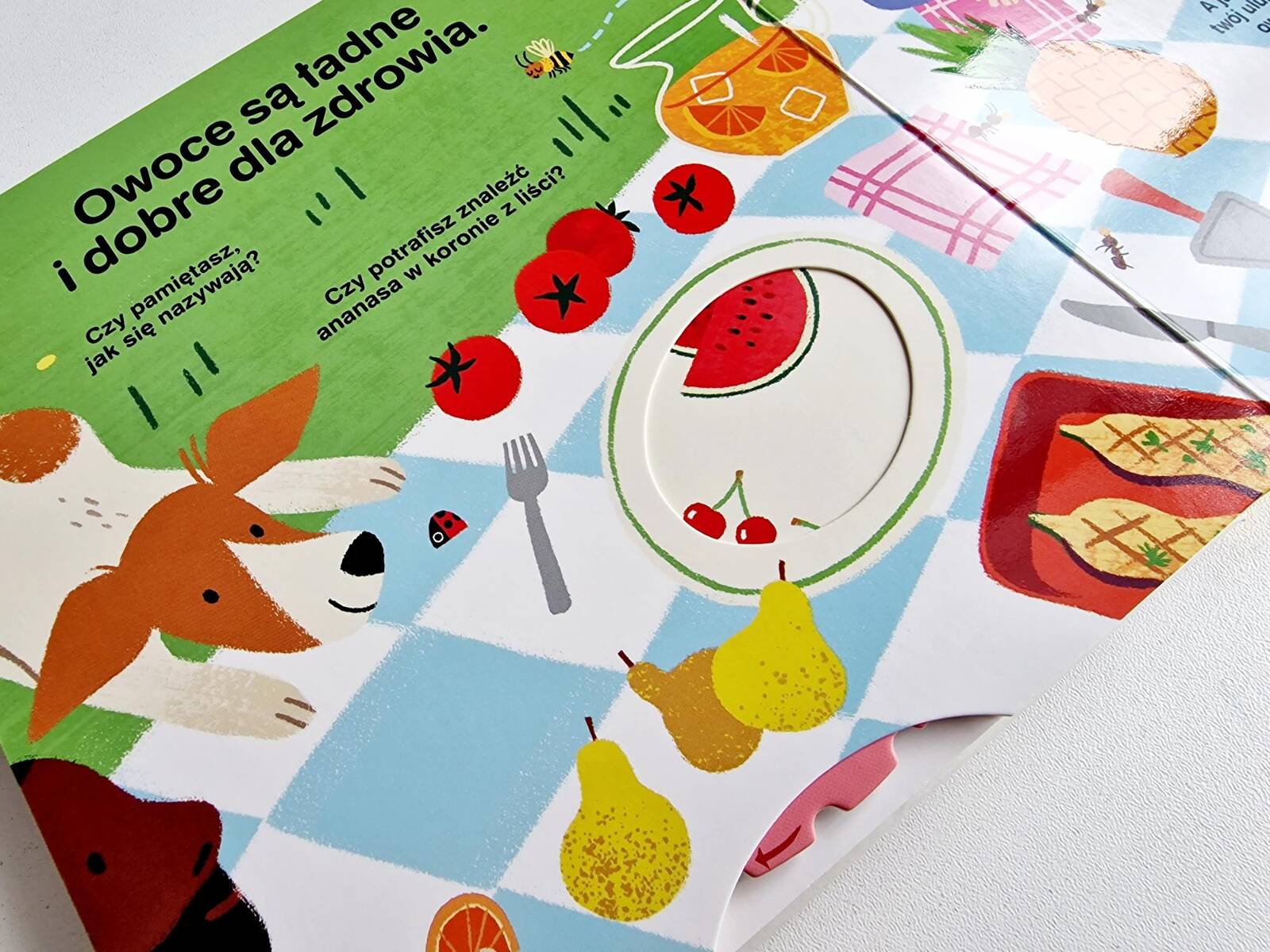 Każda strona książeczki przedstawia inne owoce, które maluch może poznawać lepiej, otwierając okienka. Mój synek z radością je otwierał, poznając przy tym nowe nazwy. Ta forma interakcji rozwija jego zdolności manualne, ale także wzbogaca słownictwo i pobudza ciekawość świata. Oczywiście mam tu na myśli wspólną zabawę, ale do samodzielnego „czytania” książeczka również jest fajna.