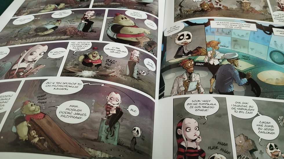 Humor. To po pierwsze i najważniejsze. Ten komiks po prostu nie może już być śmieszniejszy. Choć przyznać trzeba, że jest to humor dość makabryczny i czarny, a wspomniane już opisy robienia kanapek z trupów, czy instrukcja kopania grobu to normalność. Jednak ja taki humor kupuję. Co wrażliwsi jednak mogą nie zdzierżyć i im też radzę sięgnąć po inną lekturę. Bo o ile Margolka wygląda całkiem po ludzku, Zombiaczek też nie jest aż taki straszny (dziura w głowie jest praktycznie niedostrzegalna), to już reszta towarzystwa ma cechy typowych zombie. Wiecie, zieloność cery, odpadające kawałki ciała i takie tam przyjemności.