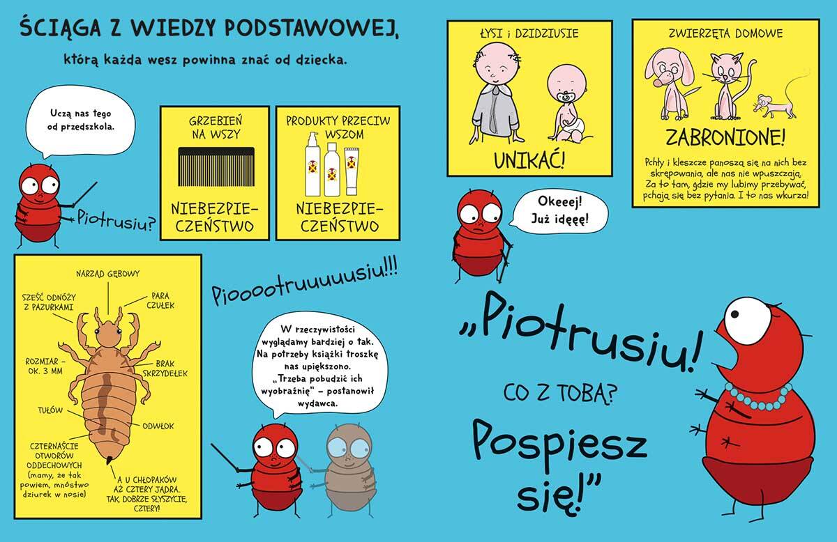Głównymi bohaterami są… wszy! A dokładniej rodzina Piotrusia Weszołka, która wiecznie się przeprowadza – z głowy na głowę. Dlaczego? Czego się boją? I przede wszystkim – jak można się ich pozbyć? Książka w zabawny sposób tłumaczy, czym są te małe pasożyty, obala mity (np. że wszawica to efekt braku higieny) i pokazuje skuteczne sposoby radzenia sobie z problemem.