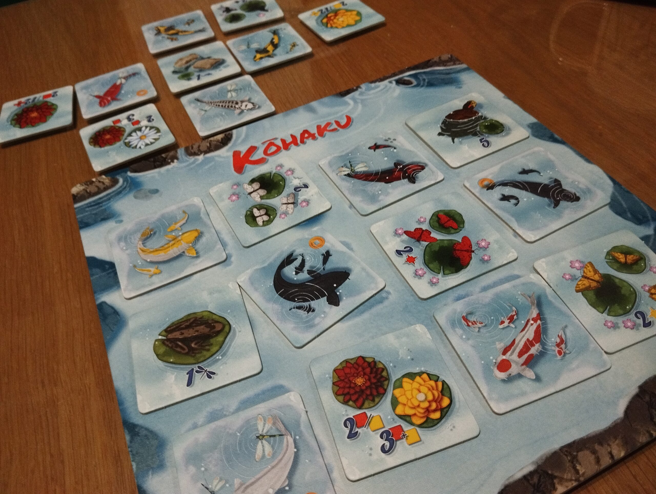 Rozgrywka trwa około trzydziestu pięciu minut, co czyni ją idealną na szybki relaks po długim dniu lub krótką przerwę między zajęciami. Gra należy do spokojnych, a mechanika opiera się na układaniu kafelków w taki sposób, by tworzyć harmonijny staw i zdobywać punkty za przemyślane kombinacje. Kafelki dzielą się na ryby i ozdoby, a ich wzajemne relacje – np. żaba obok ważki czy kamień chroniący narybek – wpływają na końcowy wynik. Na początku może się wydawać to skomplikowane, ale takie nie jest, a nawet, jeśli ktoś się pogubi – ściągawki pomagają.